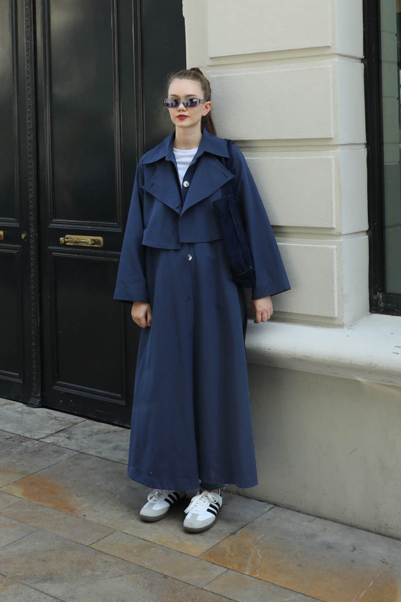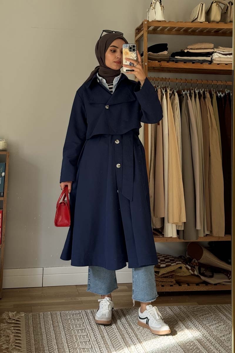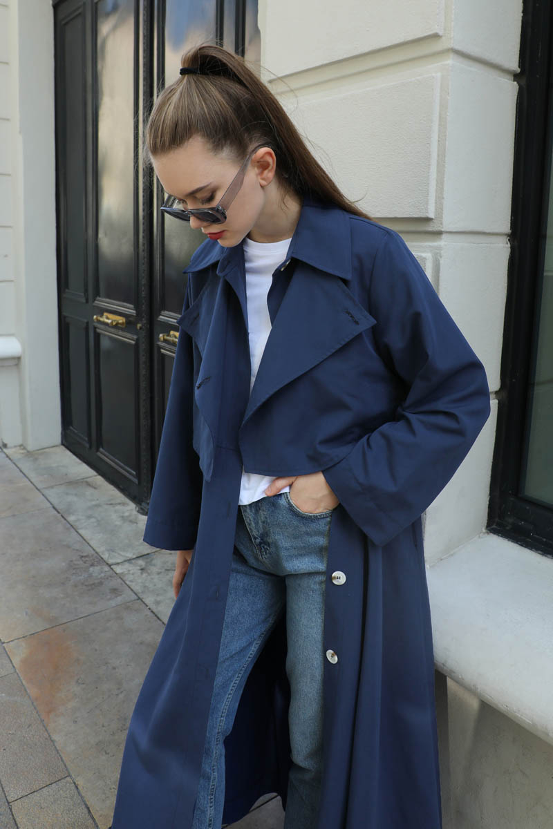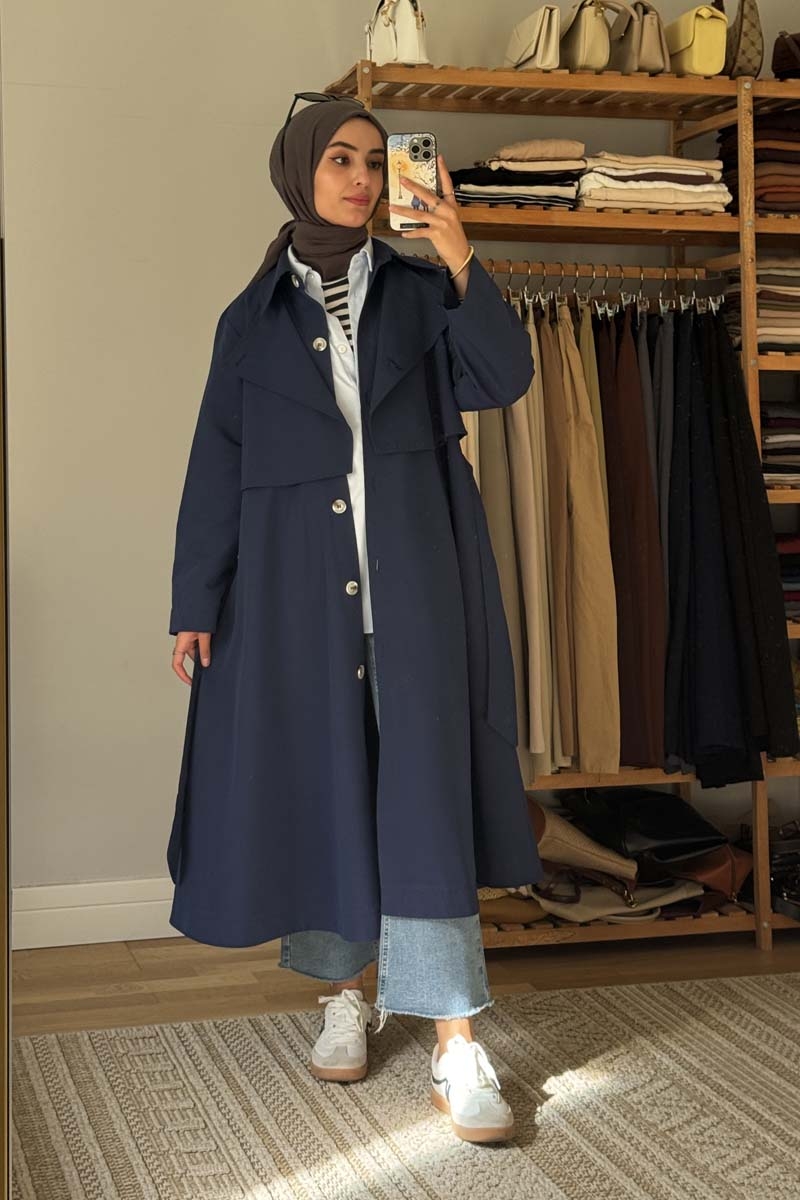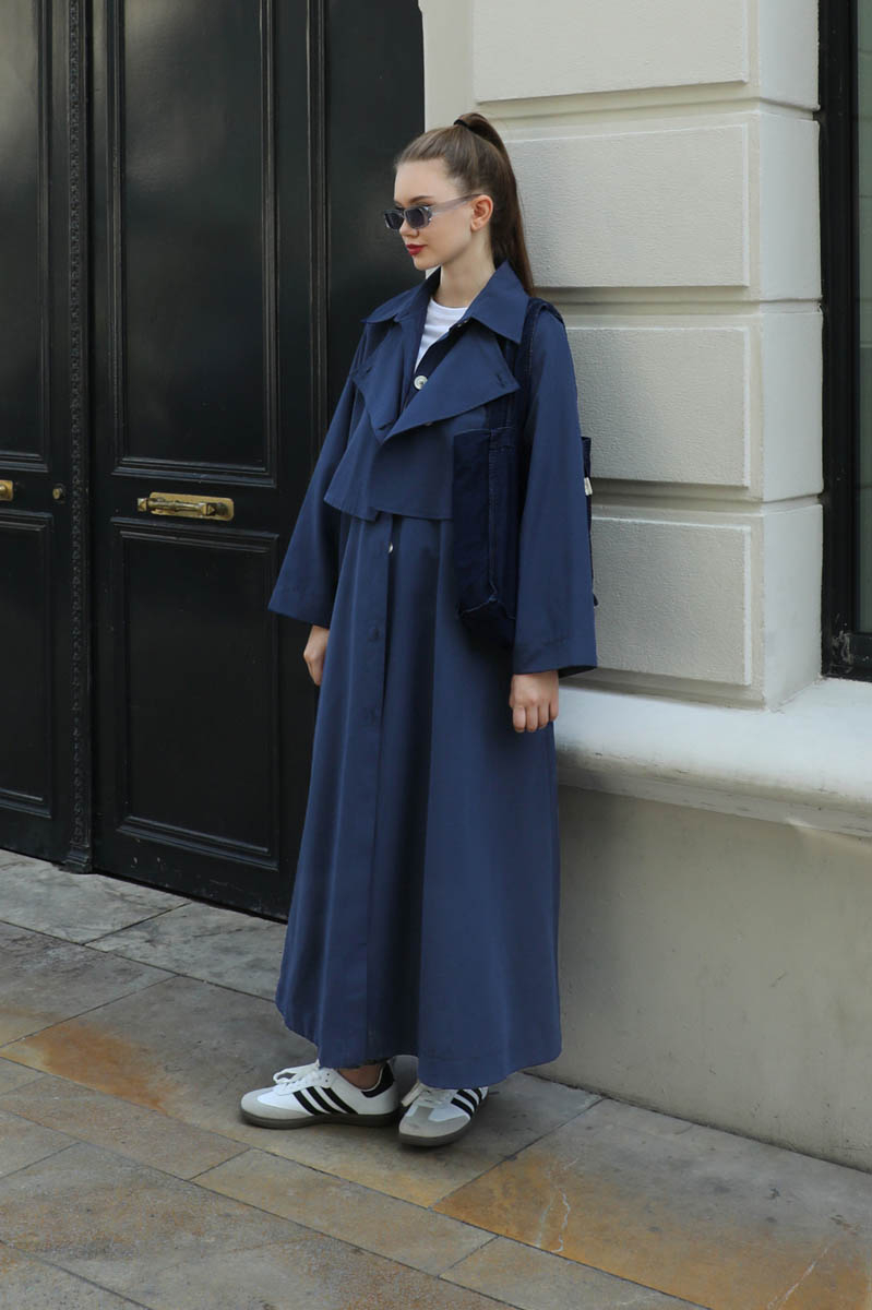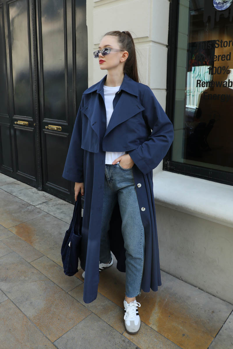 Parçalı Kloş Trençkot Siyah. Gömlek yakadır, ceket parça detaylıdır. Üst parçada yaka ve göğüs kısmında düğmelidir. Belden aşağı kloş kalıp olup önden düğmedir. Ceplidir, kuşaklıdır, astarsızdır. Günlük kullanım ve özel günlerinizde tercih edebilirsiniz.