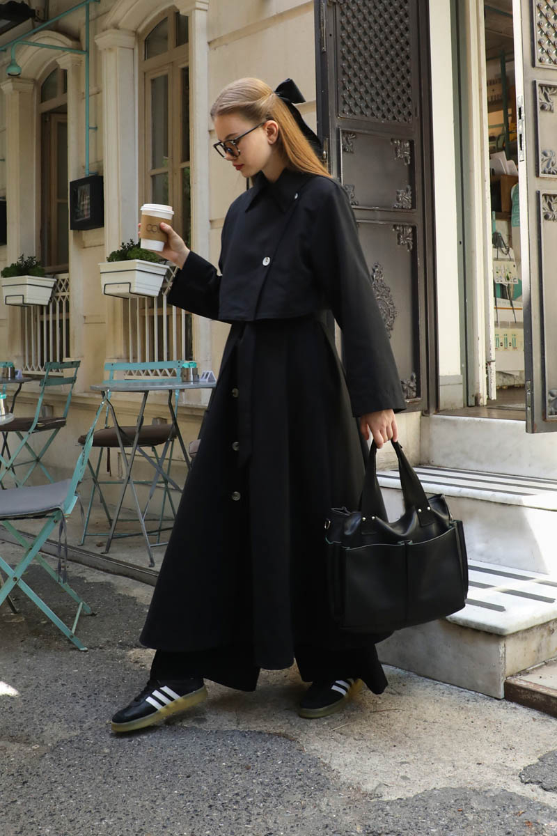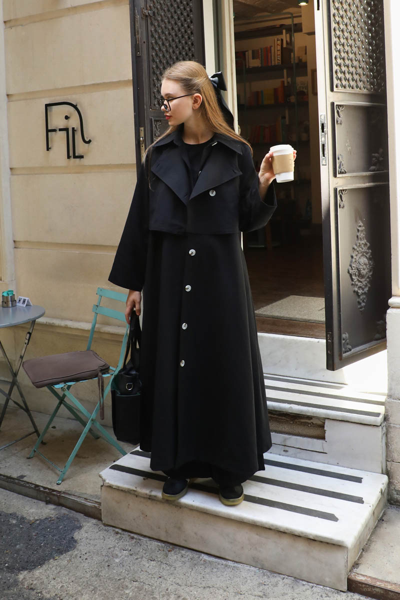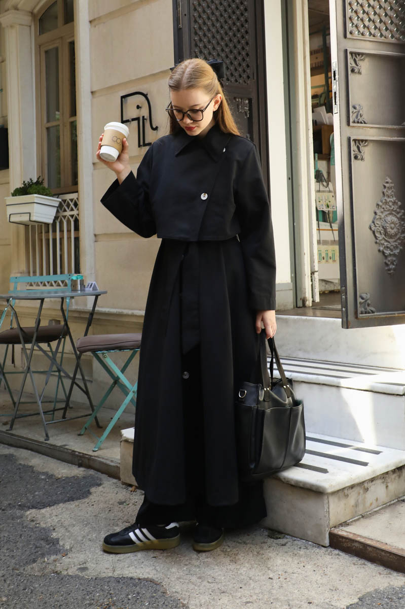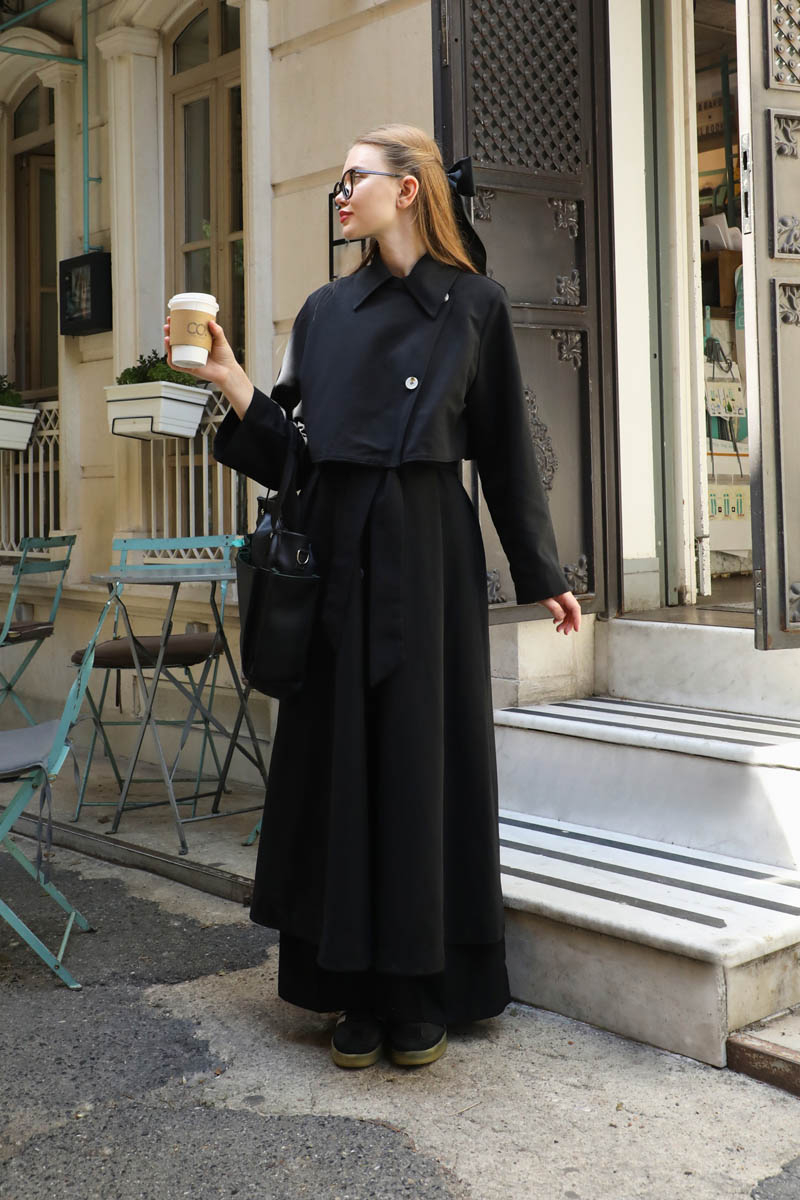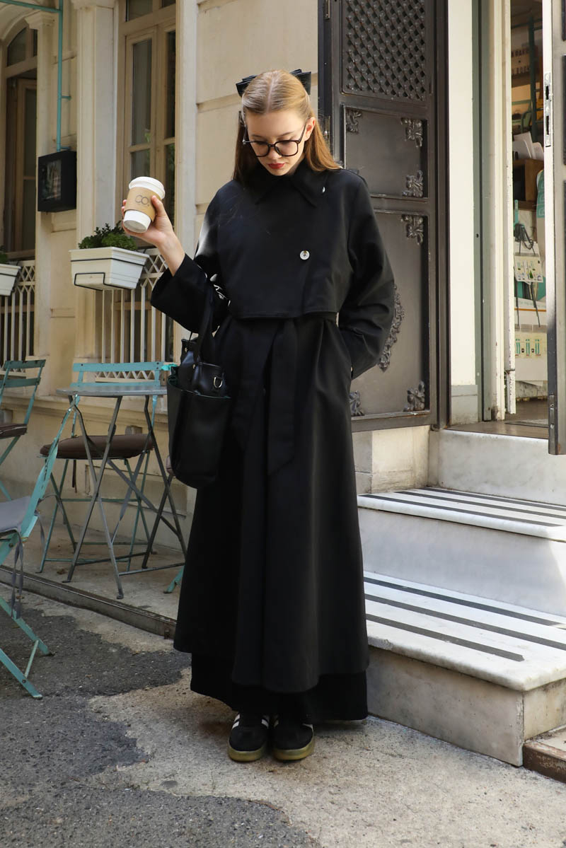 Parçalı Kloş Trençkot Siyah