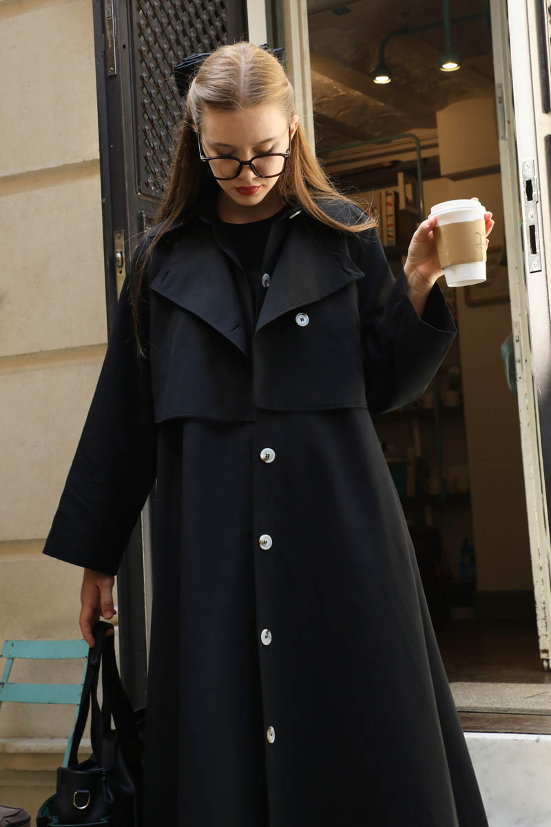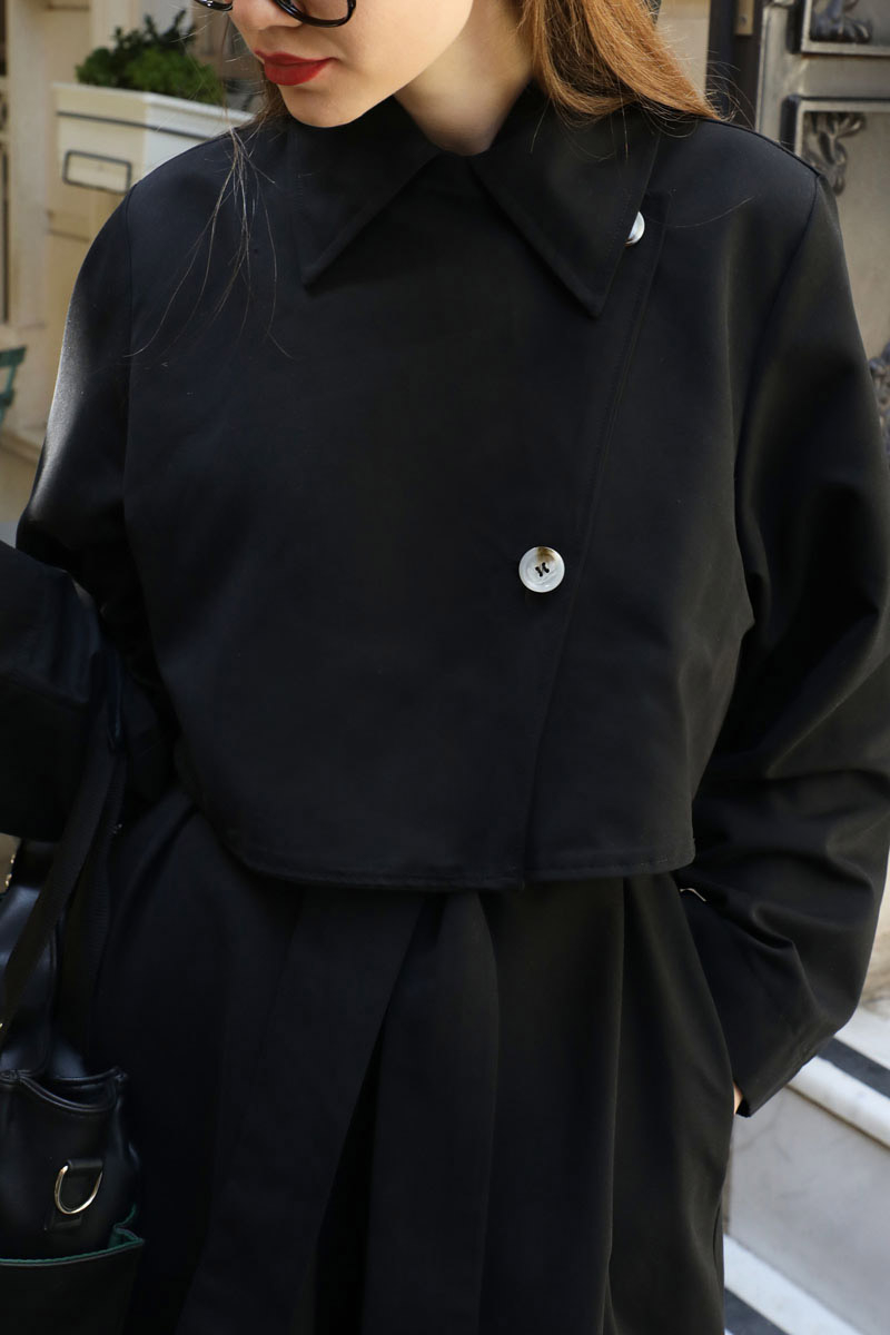 Parçalı Kloş Trençkot Siyah. Gömlek yakadır, ceket parça detaylıdır. Üst parçada yaka ve göğüs kısmında düğmelidir. Belden aşağı kloş kalıp olup önden düğmedir. Ceplidir, kuşaklıdır, astarsızdır. Günlük kullanım ve özel günlerinizde tercih edebilirsiniz.