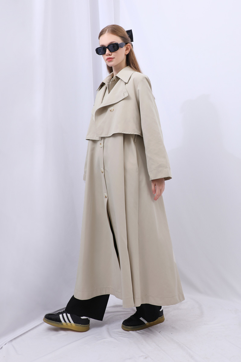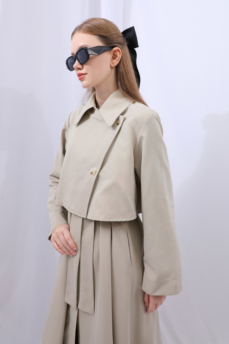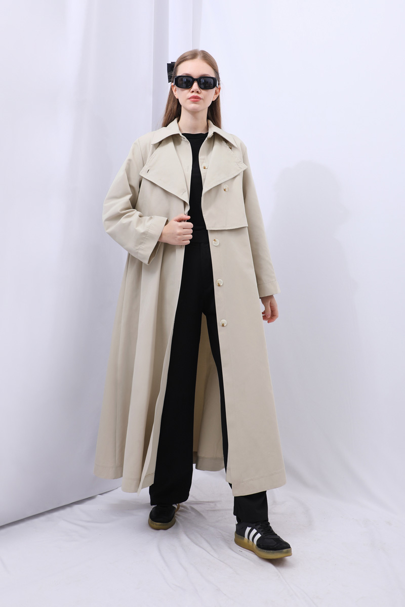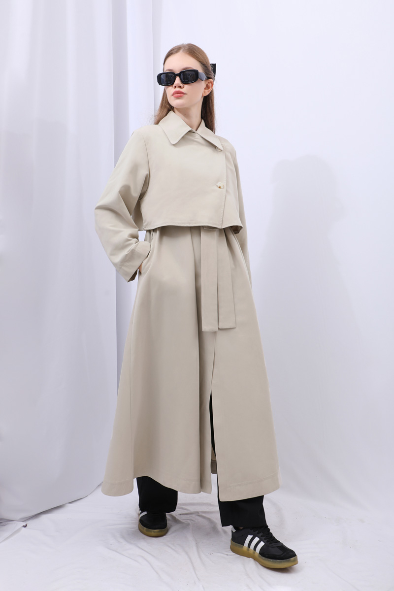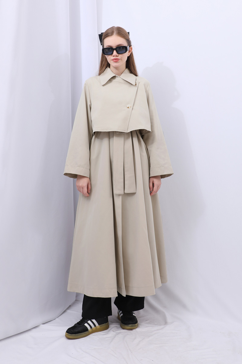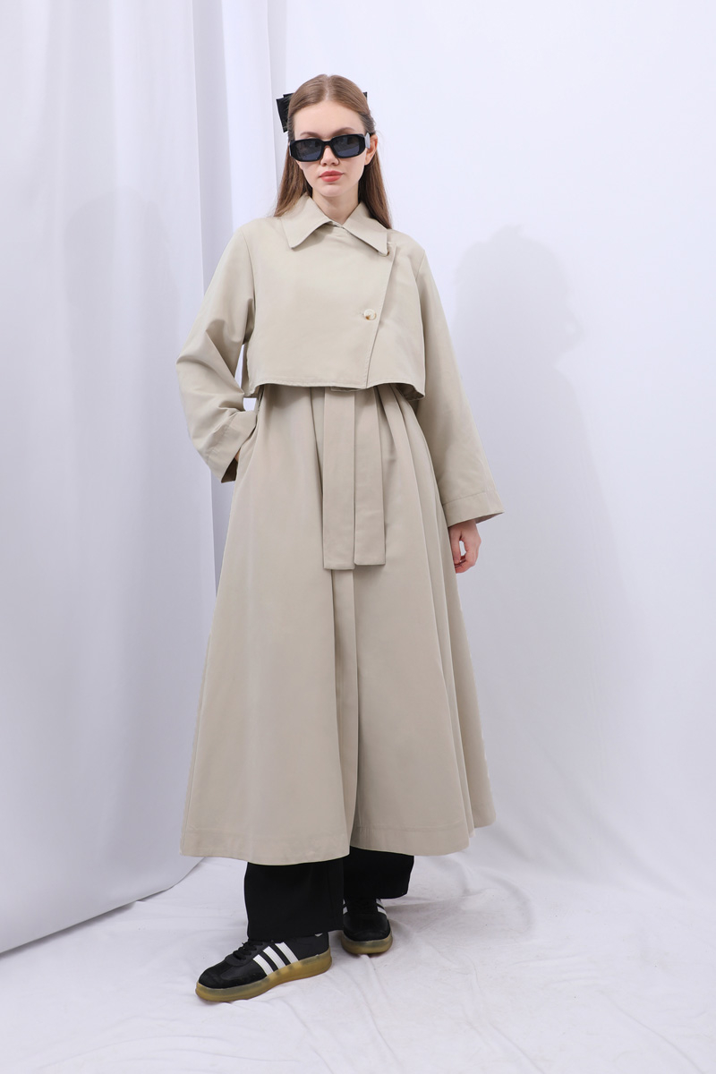 Parçalı Kloş Trençkot Taş. Gömlek yakadır, ceket parça detaylıdır. Üst parçada yaka ve göğüs kısmında düğmelidir. Belden aşağı kloş kalıp olup önden düğmedir. Ceplidir, kuşaklıdır, astarsızdır. Günlük kullanım ve özel günlerinizde tercih edebilirsiniz.
