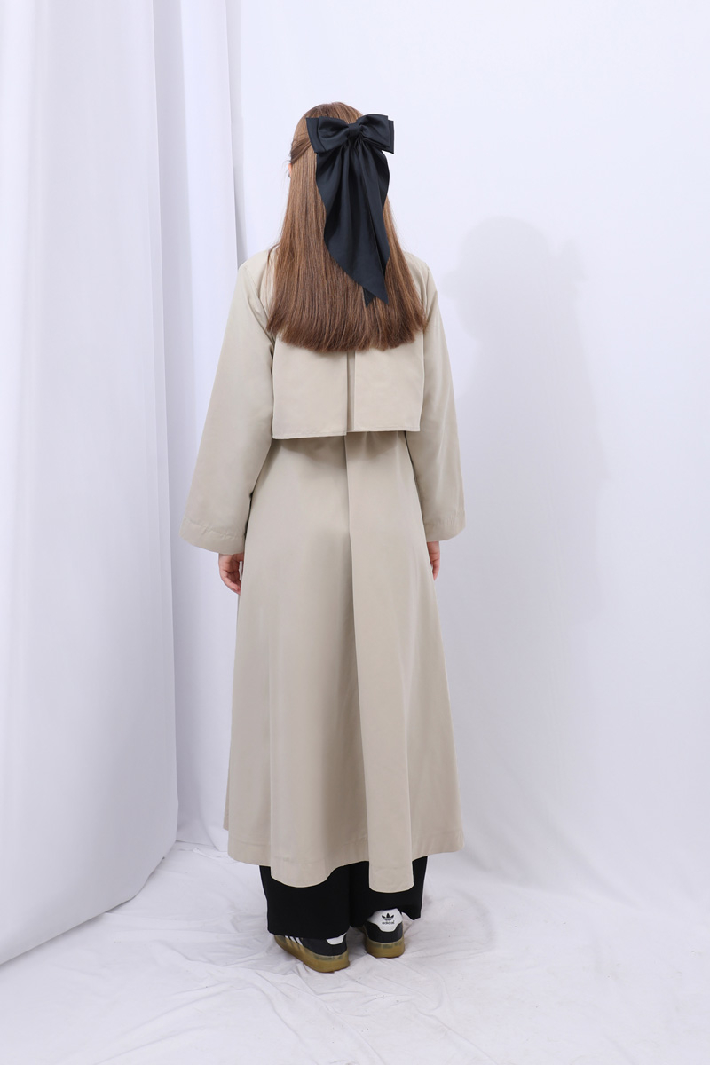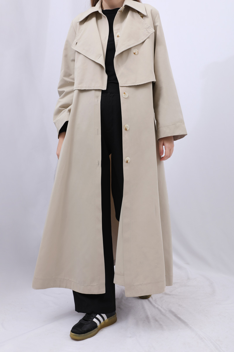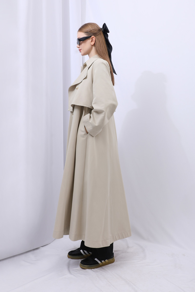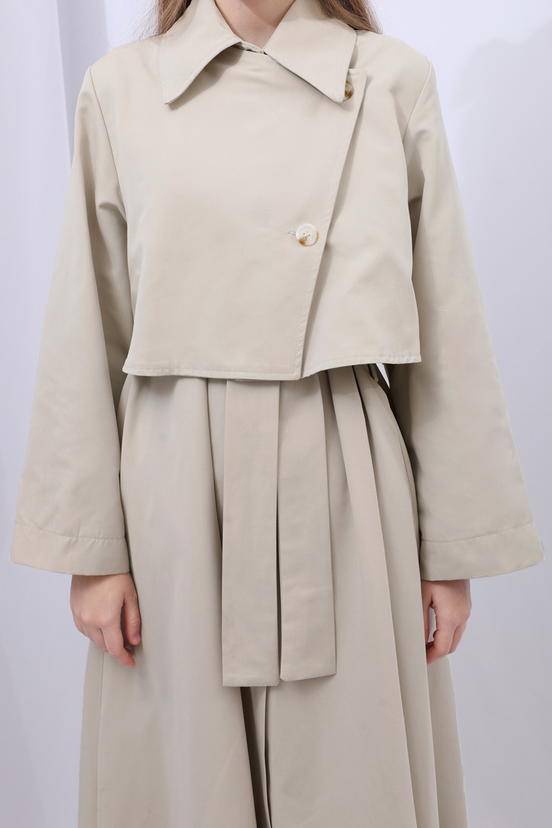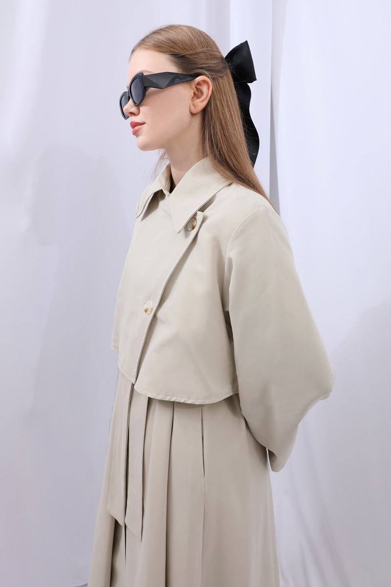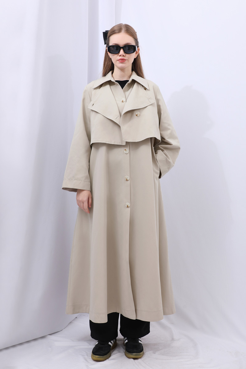 Parçalı Kloş Trençkot Taş. Gömlek yakadır, ceket parça detaylıdır. Üst parçada yaka ve göğüs kısmında düğmelidir. Belden aşağı kloş kalıp olup önden düğmedir. Ceplidir, kuşaklıdır, astarsızdır. Günlük kullanım ve özel günlerinizde tercih edebilirsiniz.