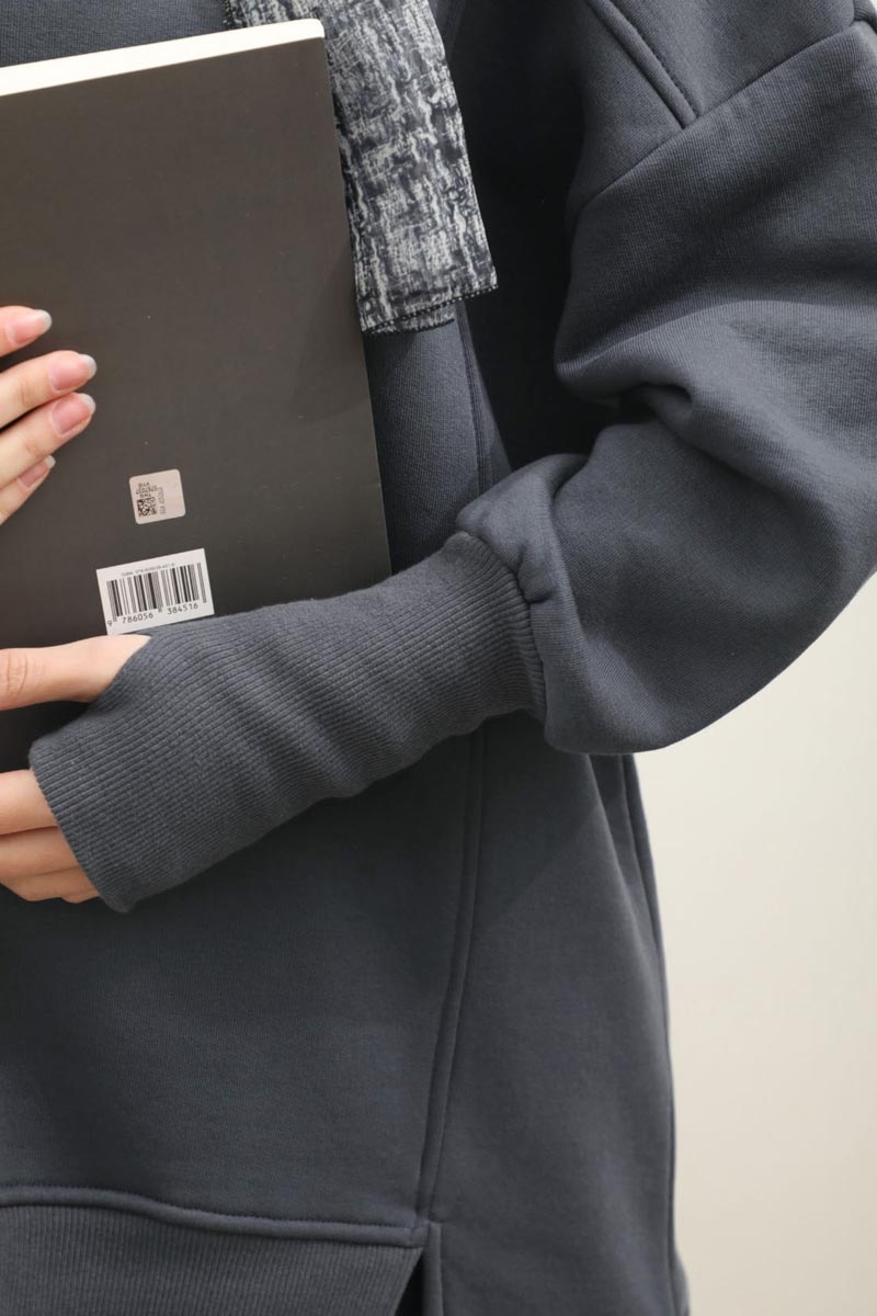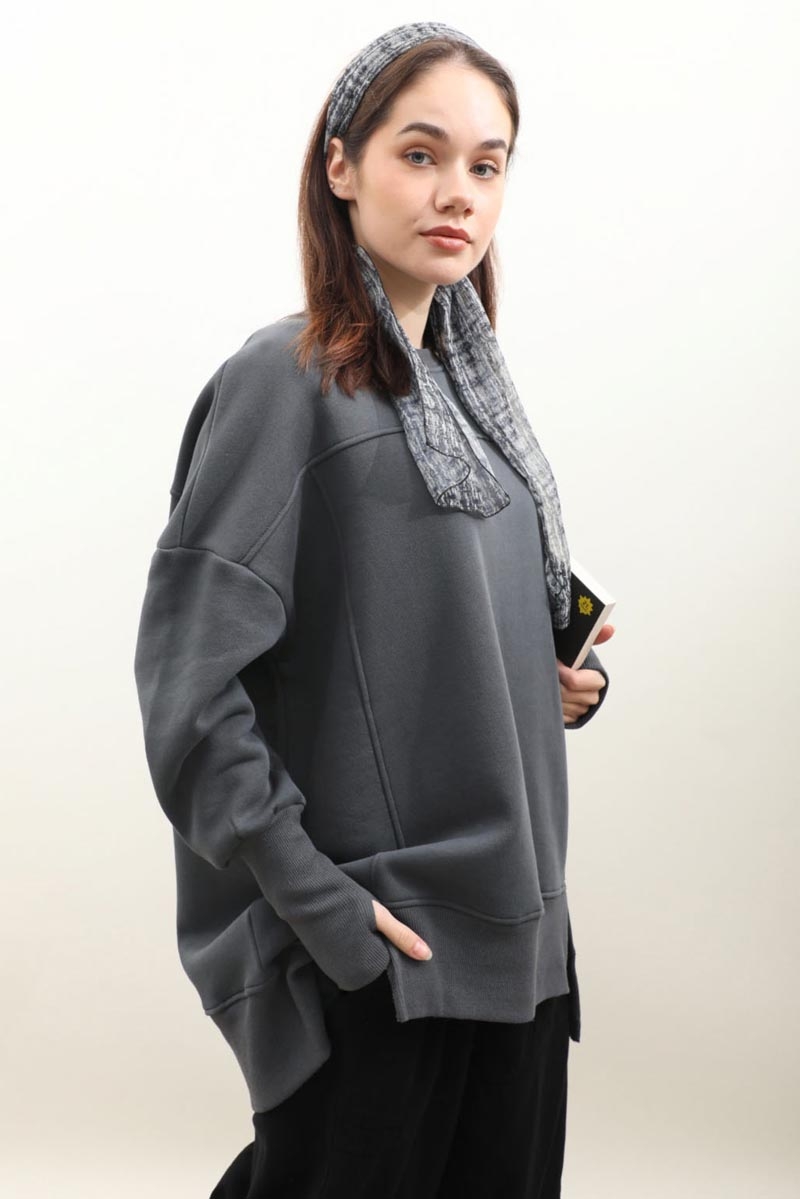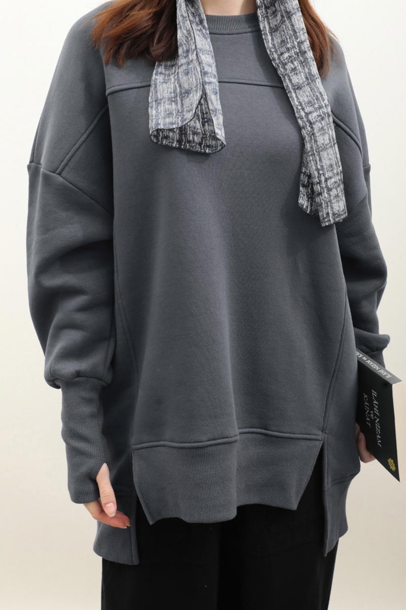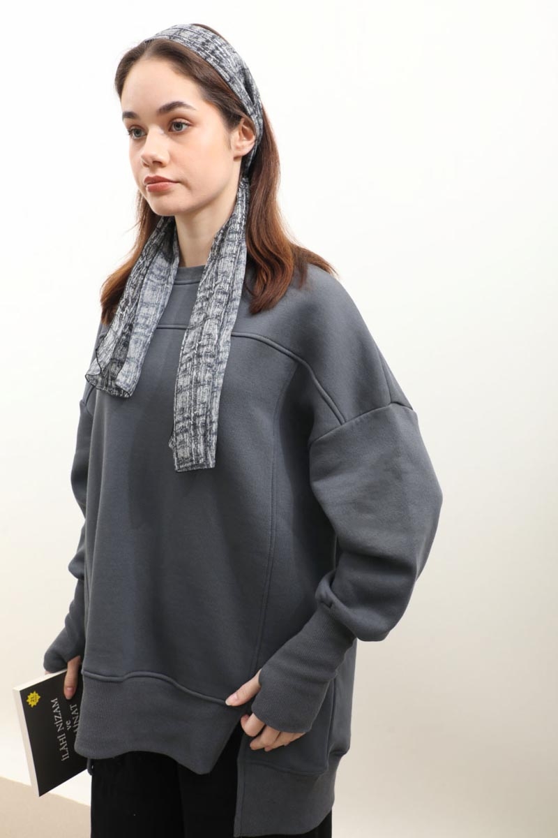 Parmak Geçirme Detaylı Sweatshirt Antrasit. Bisiklet yakadır, düşük omuzludur, ön ve arkadan dikişlidir, kalın manşetlidir, parmak geçirme detaylıdır, önü kısa ve yırtmaçlıdır, arkası uzundur, şardonludur, cepsizdir, Günlük kullanım için uygundur.
