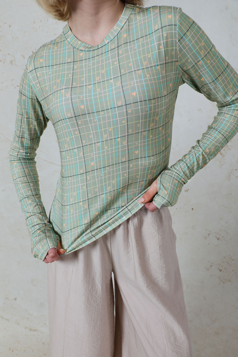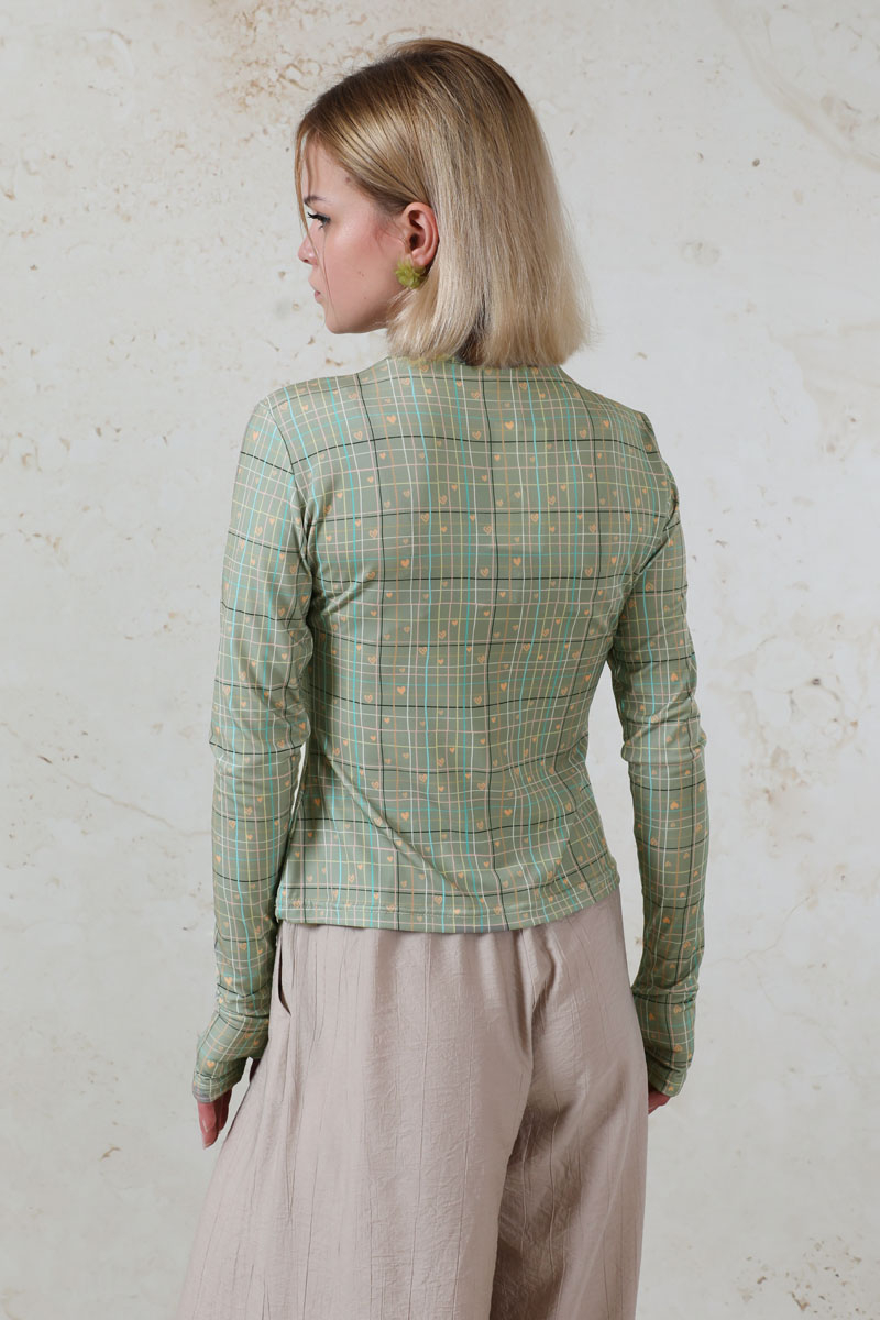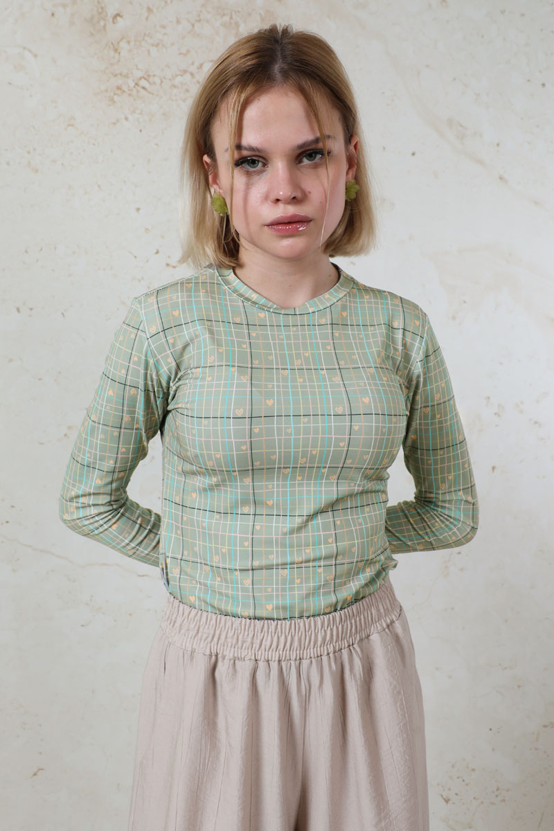 Parmaklı Kalp Body Mint. Ekose ve kalp desenlidir. Bisiklet yakalıdır. Uzun kolludur. Parmaktan geçirme detayı vardır. Yumuşak ve esnek kumaşlıdır. Günlük kullanımda tercih edebilirsiniz.