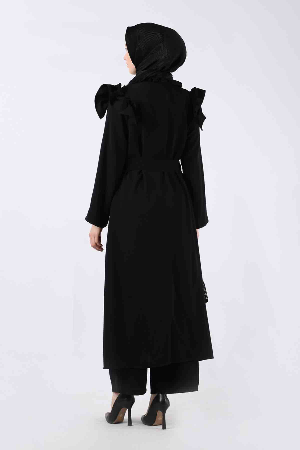 Pearl Embroidered Abaya Suit Black. It has pockets. It is belted. It has ruffle details on the shoulders. Pearl detail. Trousers are high waisted and elastic. It is one of the favorite products of the new season.