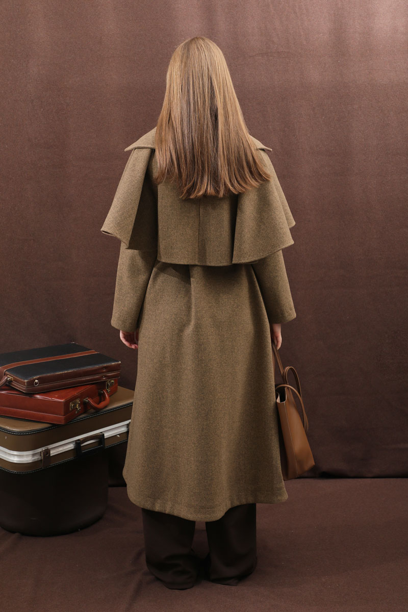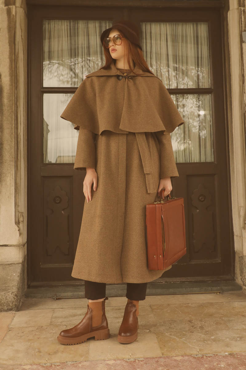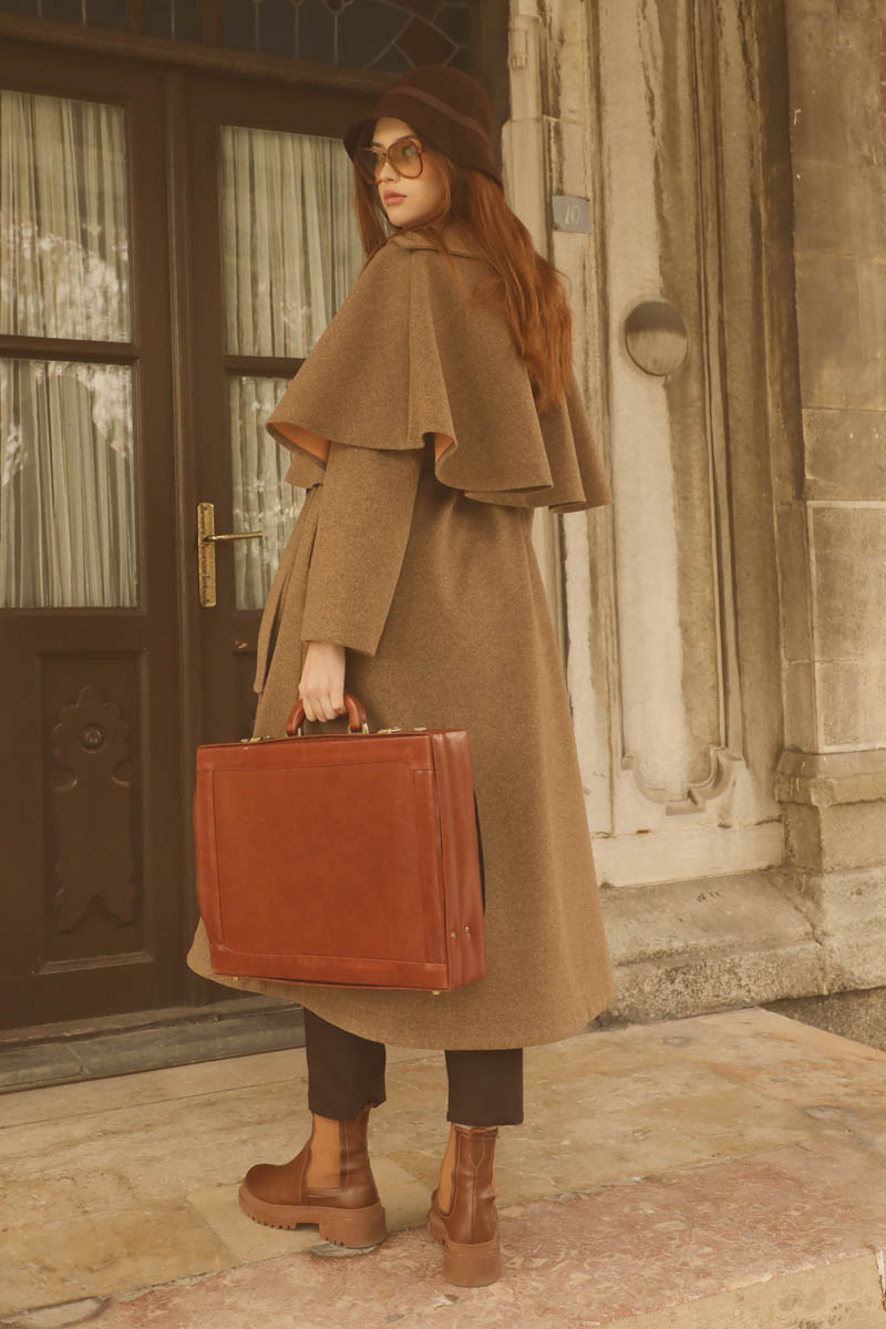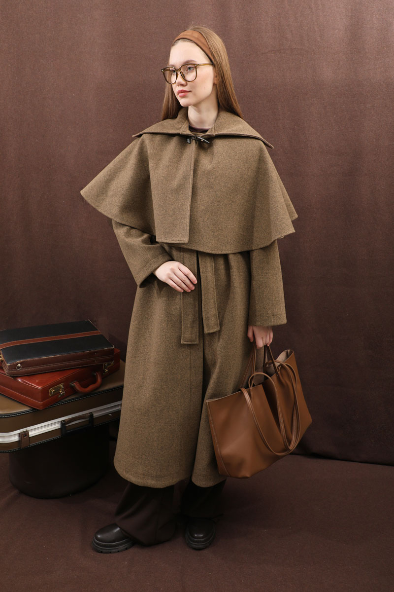 Pelerinli Kaban Taba. Bisiklet yakalıdır, gizli düğmelidir, yandan gizli ceplidir, Kloş kesimdir, Astarlıdır, kuşaklıdır, Pelerin: Geniş yakalıdır önden çoban düğmelidir. Günlük kullanım ve özel günlerinizde tercih edebilirsiniz.
