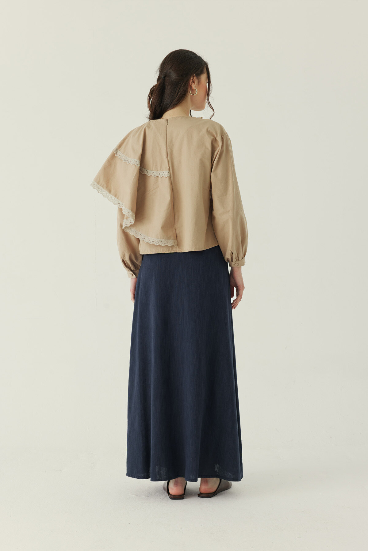 Asimetrik dantelli ön detayıyla tasarımına zarif bir karakter kazandıran Pelerinli Poplin Gömlek, rahat dökümlü kalıbıyla konforlu ve dengeli bir siluet sunar. Bisiklet yaka formu sade bir çerçeve oluştururken, pelerin etkisi veren üst yapı modele modern bir hareket katar. Günlük kombinlerden daha şık görünümlere kadar geniş bir kullanım alanına sahiptir.