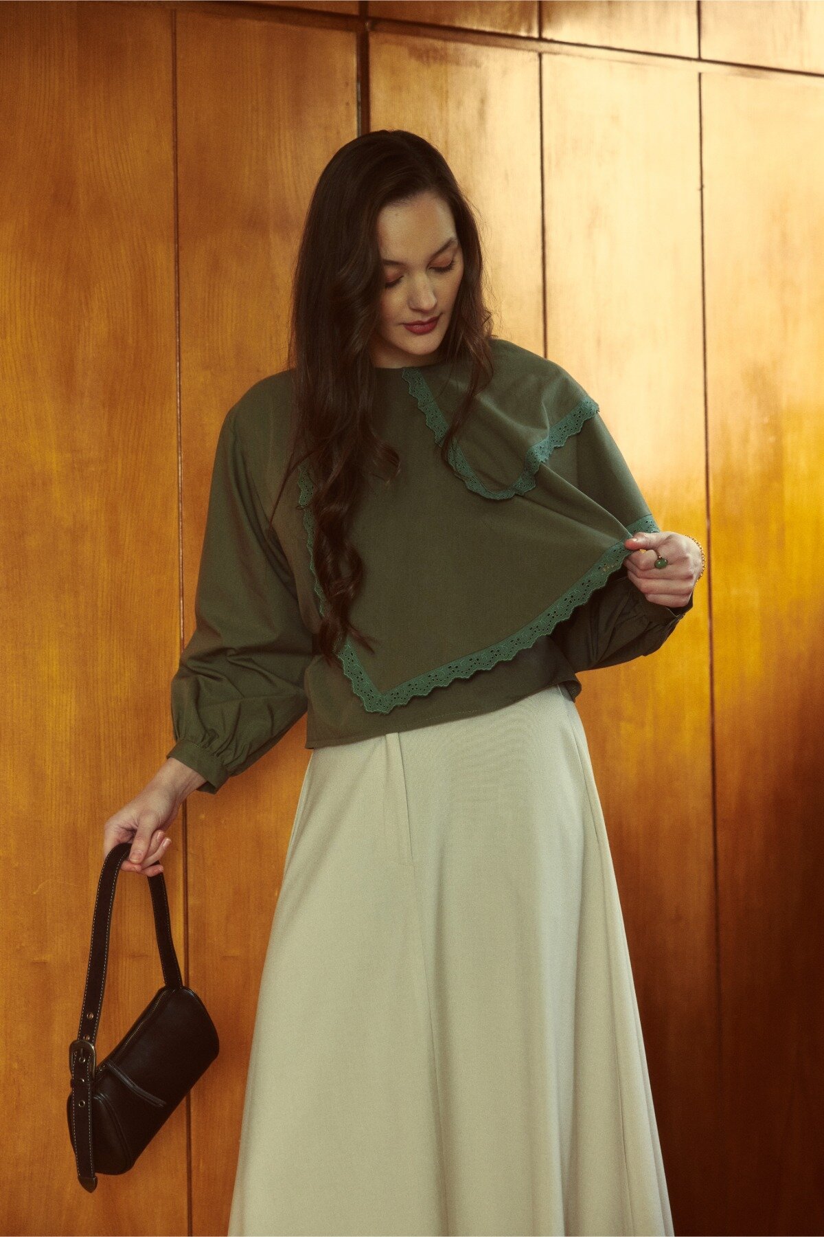 Asimetrik dantelli ön detayıyla tasarımına zarif bir karakter kazandıran Pelerinli Poplin Gömlek, rahat dökümlü kalıbıyla konforlu ve dengeli bir siluet sunar. Bisiklet yaka formu sade bir çerçeve oluştururken, pelerin etkisi veren üst yapı modele modern bir hareket katar. Günlük kombinlerden daha şık görünümlere kadar geniş bir kullanım alanına sahiptir.