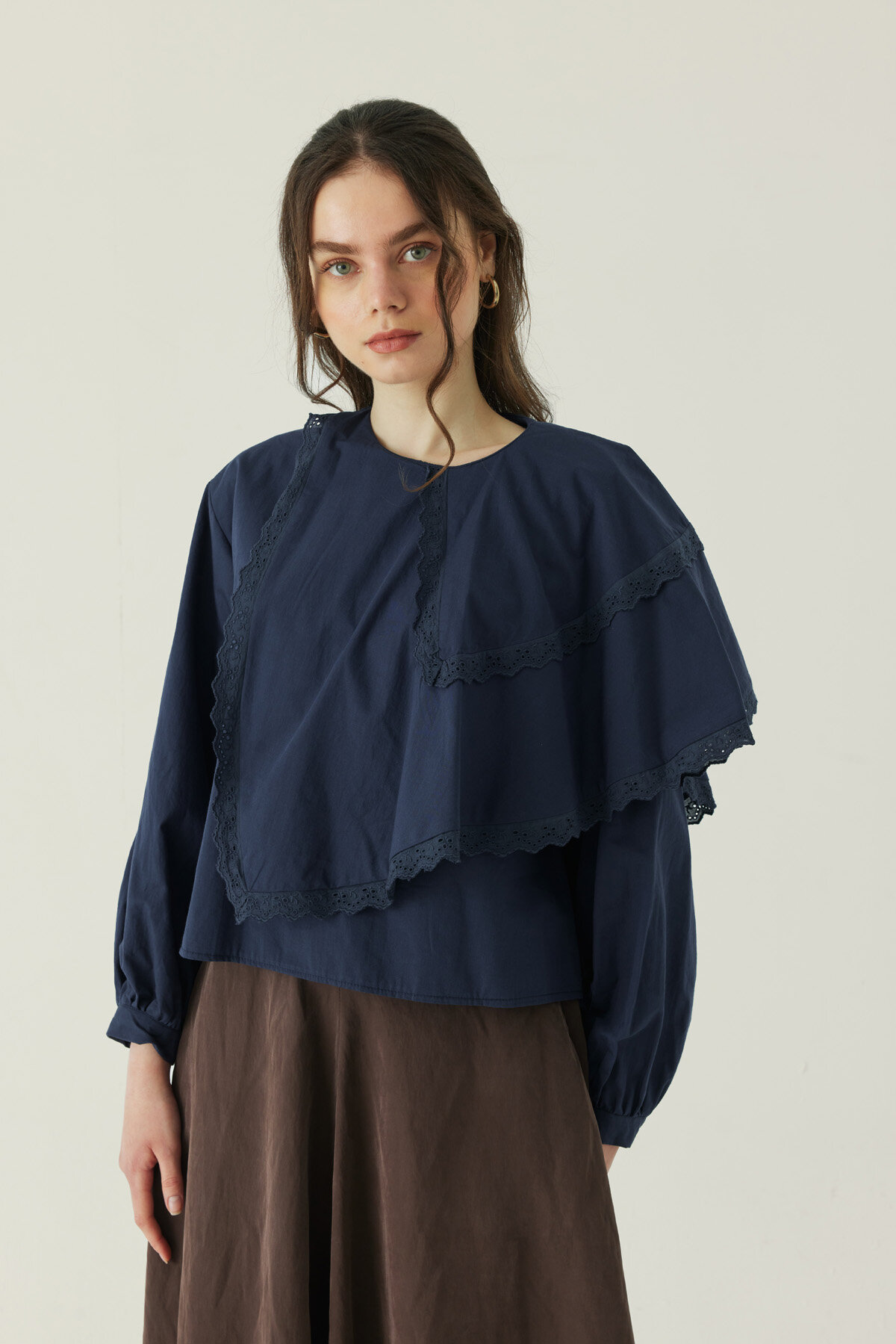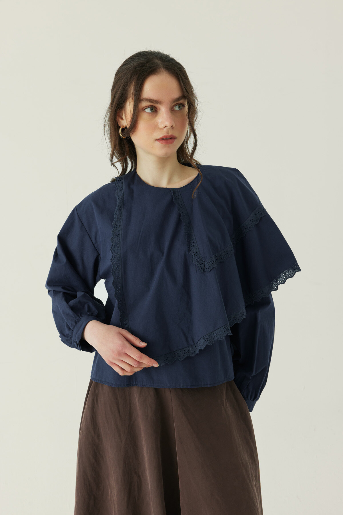 Asimetrik dantelli ön detayıyla tasarımına zarif bir karakter kazandıran Pelerinli Poplin Gömlek, rahat dökümlü kalıbıyla konforlu ve dengeli bir siluet sunar. Bisiklet yaka formu sade bir çerçeve oluştururken, pelerin etkisi veren üst yapı modele modern bir hareket katar. Günlük kombinlerden daha şık görünümlere kadar geniş bir kullanım alanına sahiptir.