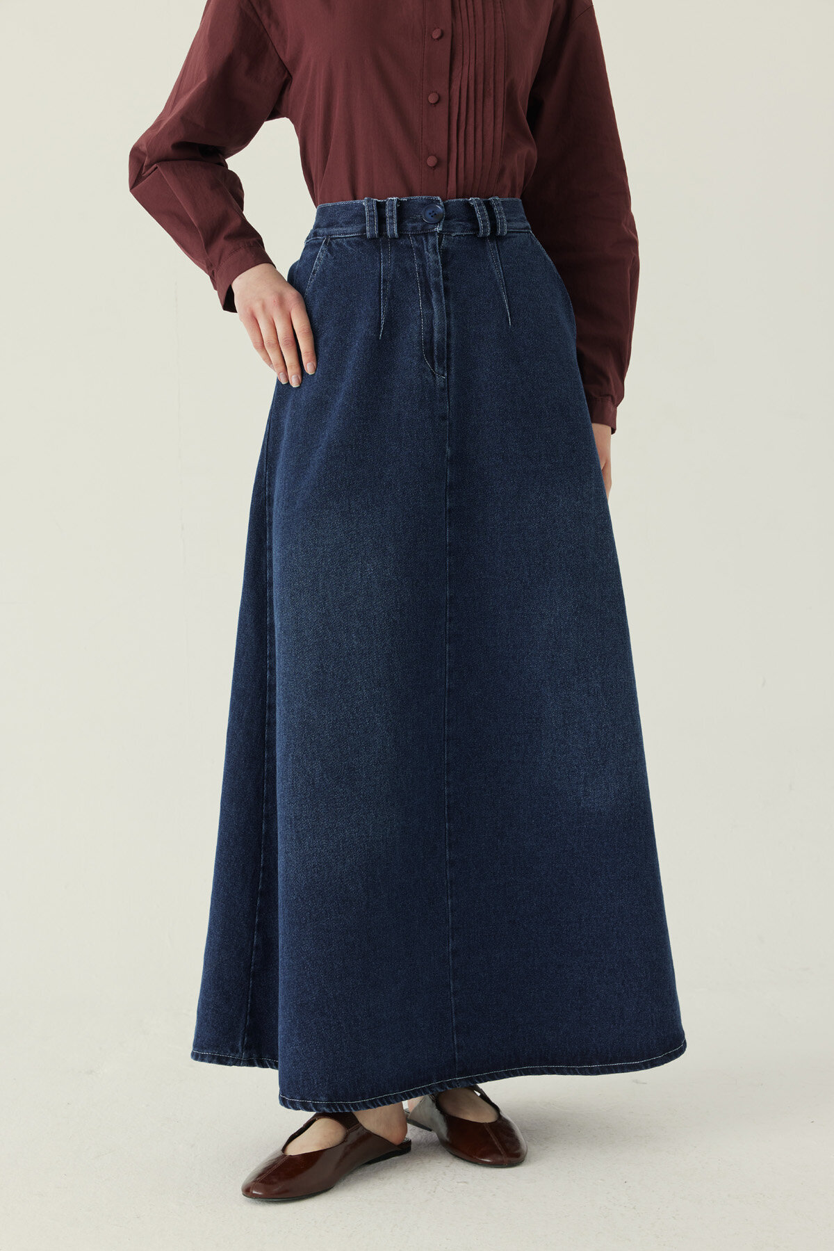 Pens Detaylı Denim Etek Mavi, sade formu ve bel hattını dengeleyen pens detaylarıyla güçlü ve net bir siluet sunar. Tok yapılı denim kumaşı sayesinde formunu korurken, akıcı olmayan ama rahat bir duruş sağlar. Yüksek bel kesimi vücut oranını dengeler; düz ve zamansız tasarımı gömlek, triko ve ceketlerle kolayca kombinlenebilir. Günlük şehir stilinden daha düzenli kombinlere kadar geniş bir kullanım alanına sahip, dolapta uzun süre yerini koruyacak bir parçadır.