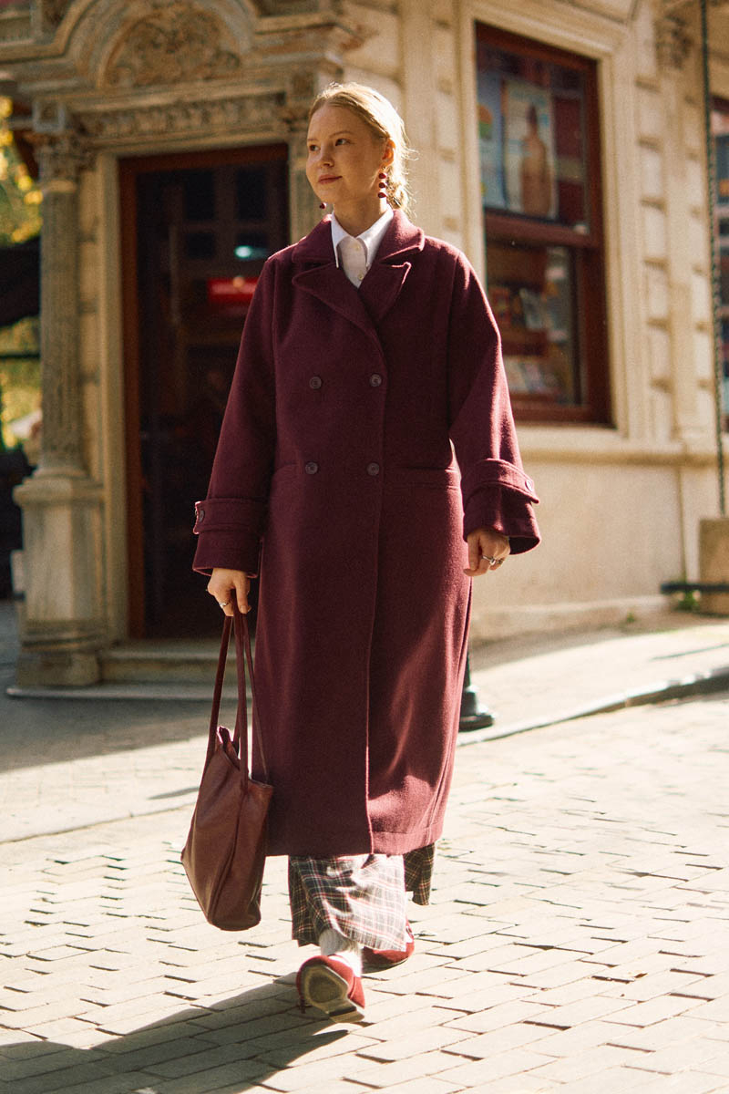 Pens Detaylı Kruvaze Kaban Bordo, klasik kaban formuna zarif dikiş detaylarıyla modern bir yorum katıyor. Ön kısmındaki pens detayları, vücut formunu nazikçe vurgularken, kruvaze yaka tasarımı sofistike bir duruş sağlar. Tok dokulu kumaşı sayesinde formunu korur ve kış mevsiminde sıcak tutar. Günlük şehir kombinlerinden ofis stiline kadar geniş bir kullanım alanı sunar.