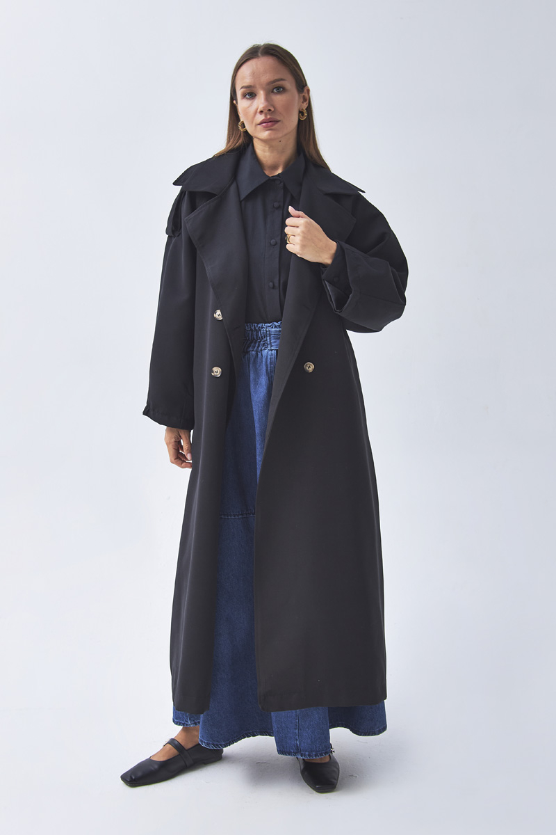 Pens Detaylı Kruvaze Trençkot Siyah