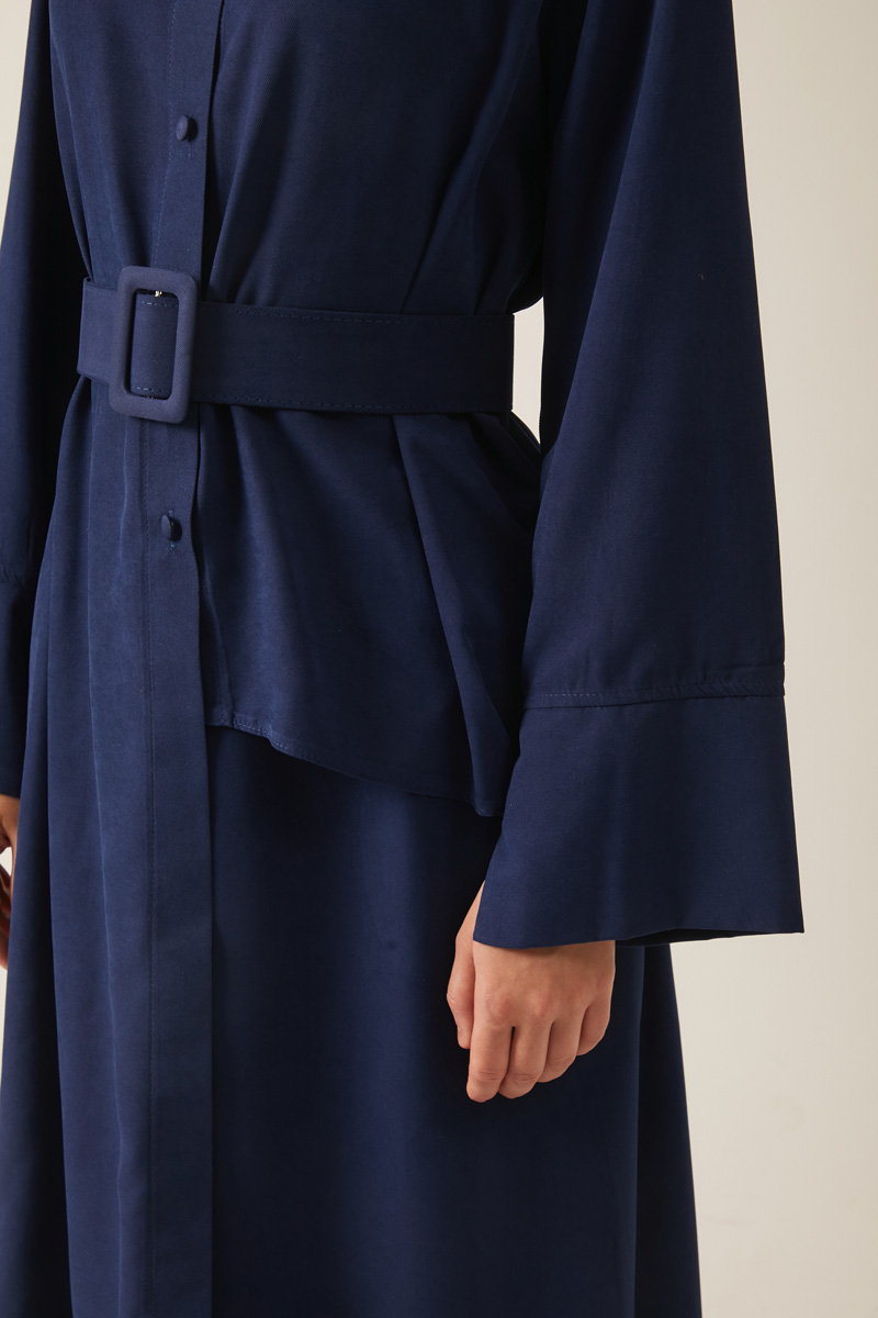 Pesen Etek Takım Lacivert. Gömlek hakim yakadır, önden düğmelidir, parça dikiş detaylı bilezik kolludur, asimetrik kesimdir, Etek belden lastiklidir, yandan ceplidir, kaplama kemer detaylıdır. Günlük kullanım ve özel günlerinizde tercih edebilirsiniz.