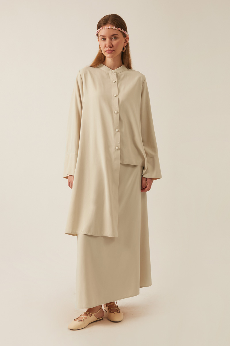 The shirt features a mandarin collar, front button fastening, panel seam details, bracelet-length sleeves, and an asymmetric cut.