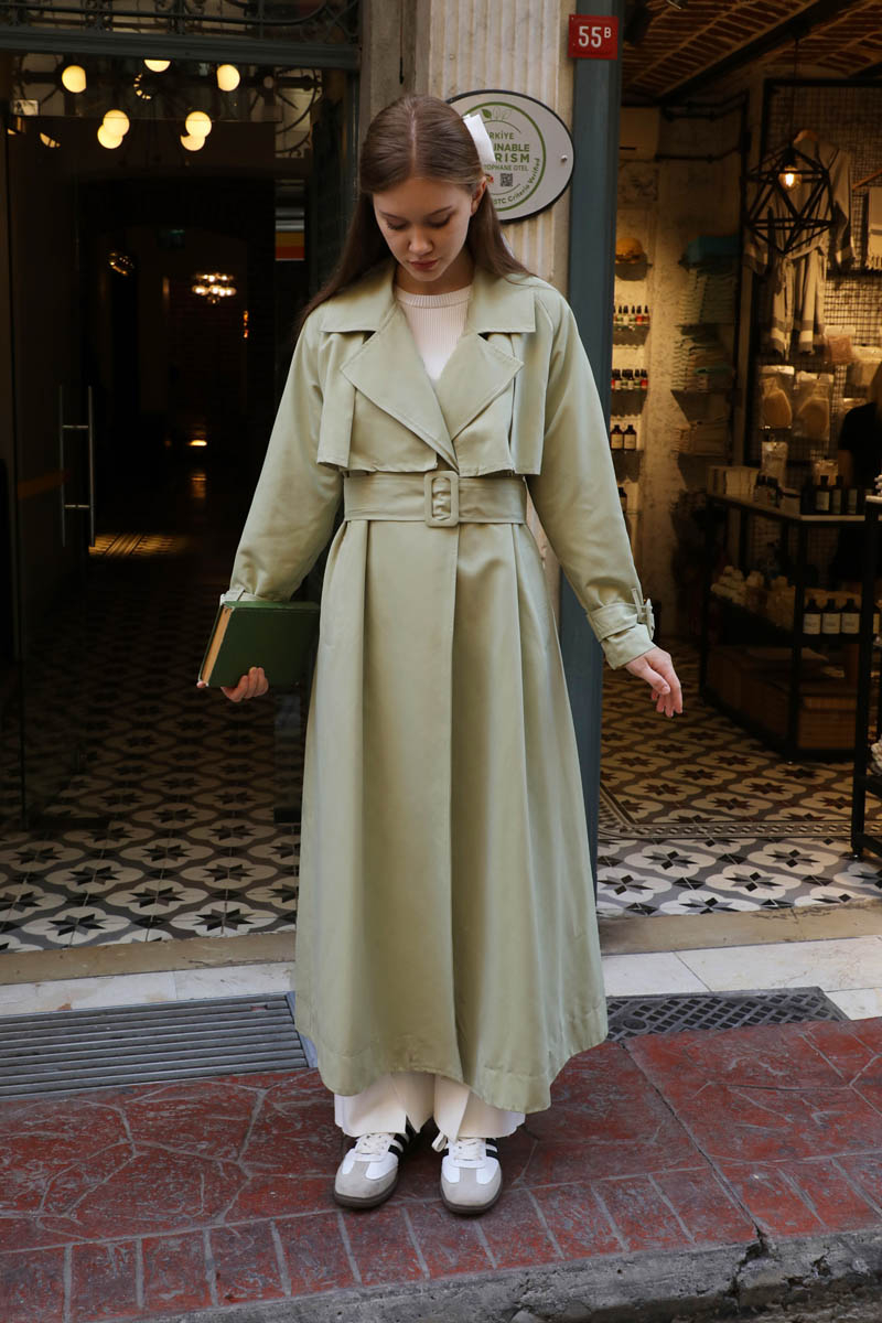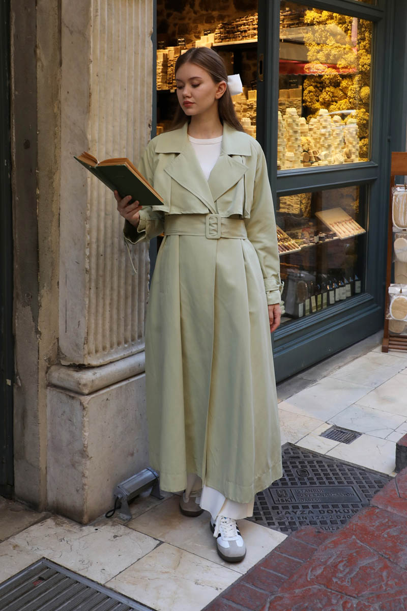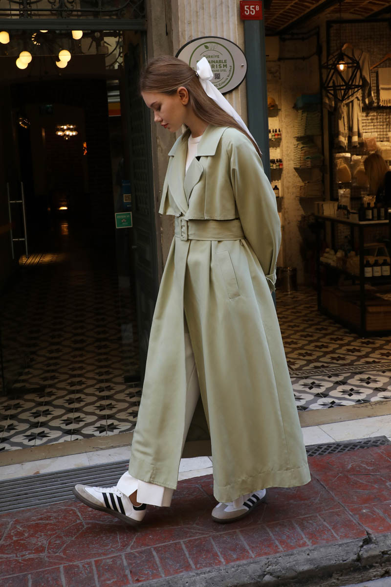 Pile Detay Trençkot Avokado. Geniş yakadır, kruvaze detaylıdır, pile rüzgarlıklıdır, reglan kolludur, bilekten apolet detaylıdır, ceplidir, kemerlidir, astarlıdır. Günlük kullanım ve özel günlerinizde tercih edebilirsiniz.