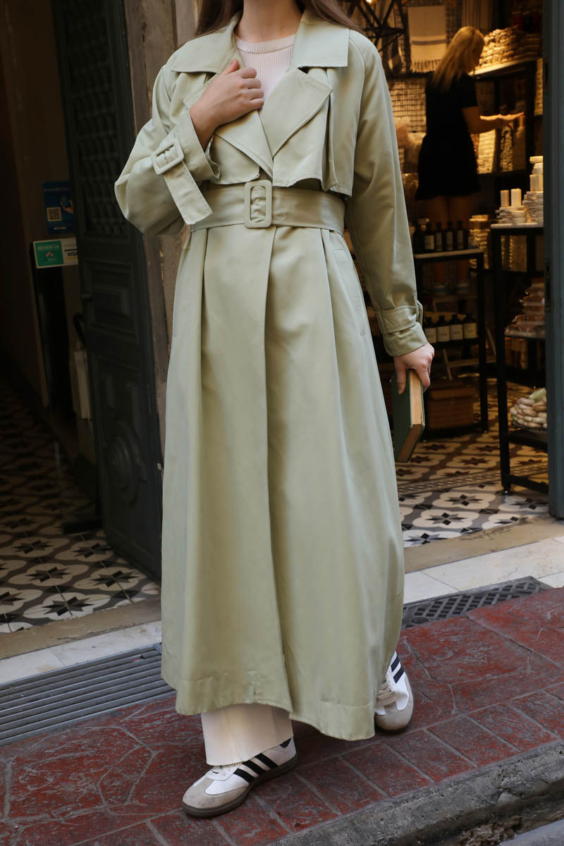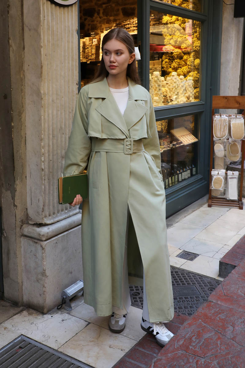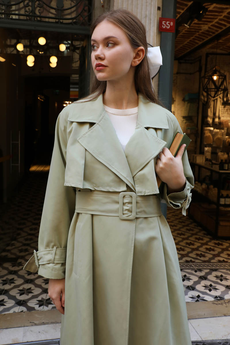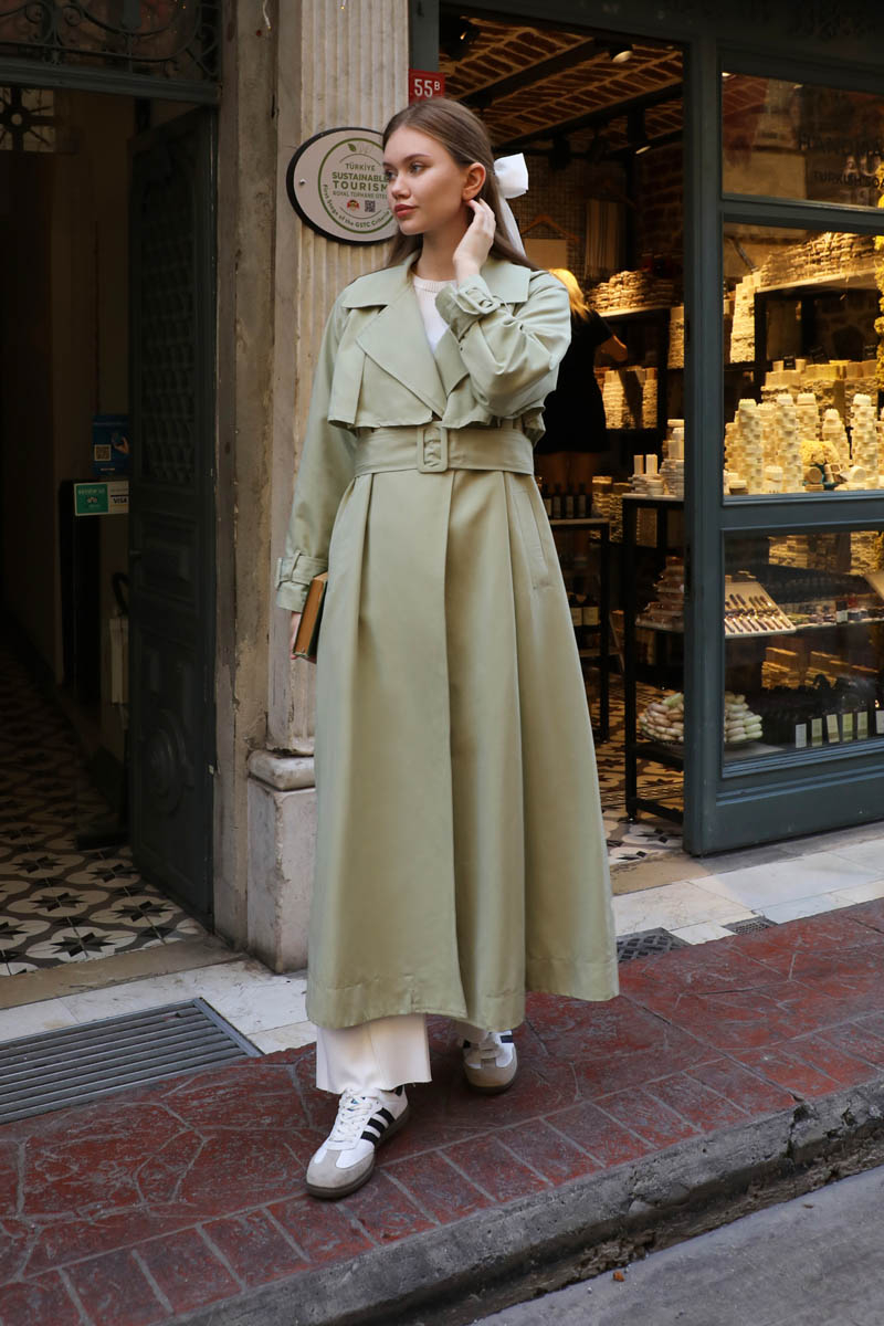 Pile Detay Trençkot Avokado. Geniş yakadır, kruvaze detaylıdır, pile rüzgarlıklıdır, reglan kolludur, bilekten apolet detaylıdır, ceplidir, kemerlidir, astarlıdır. Günlük kullanım ve özel günlerinizde tercih edebilirsiniz.