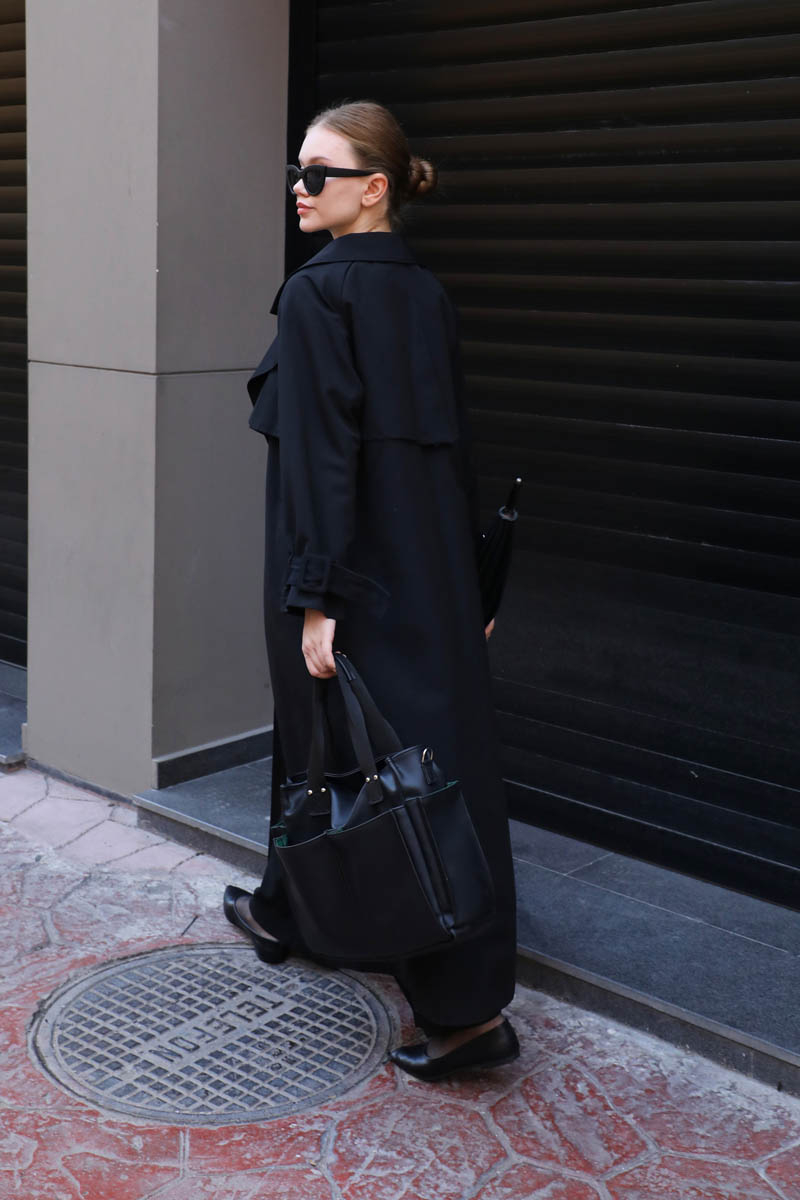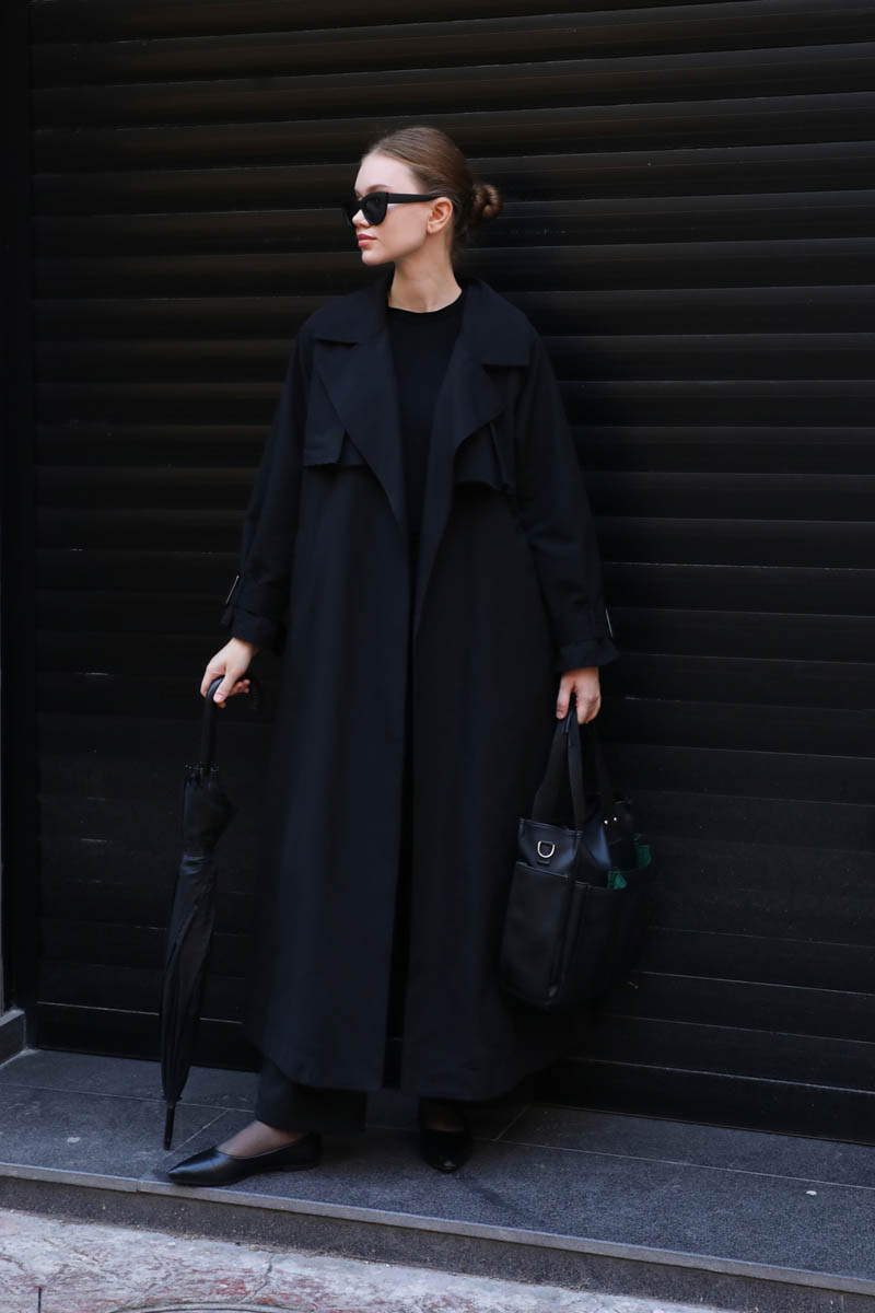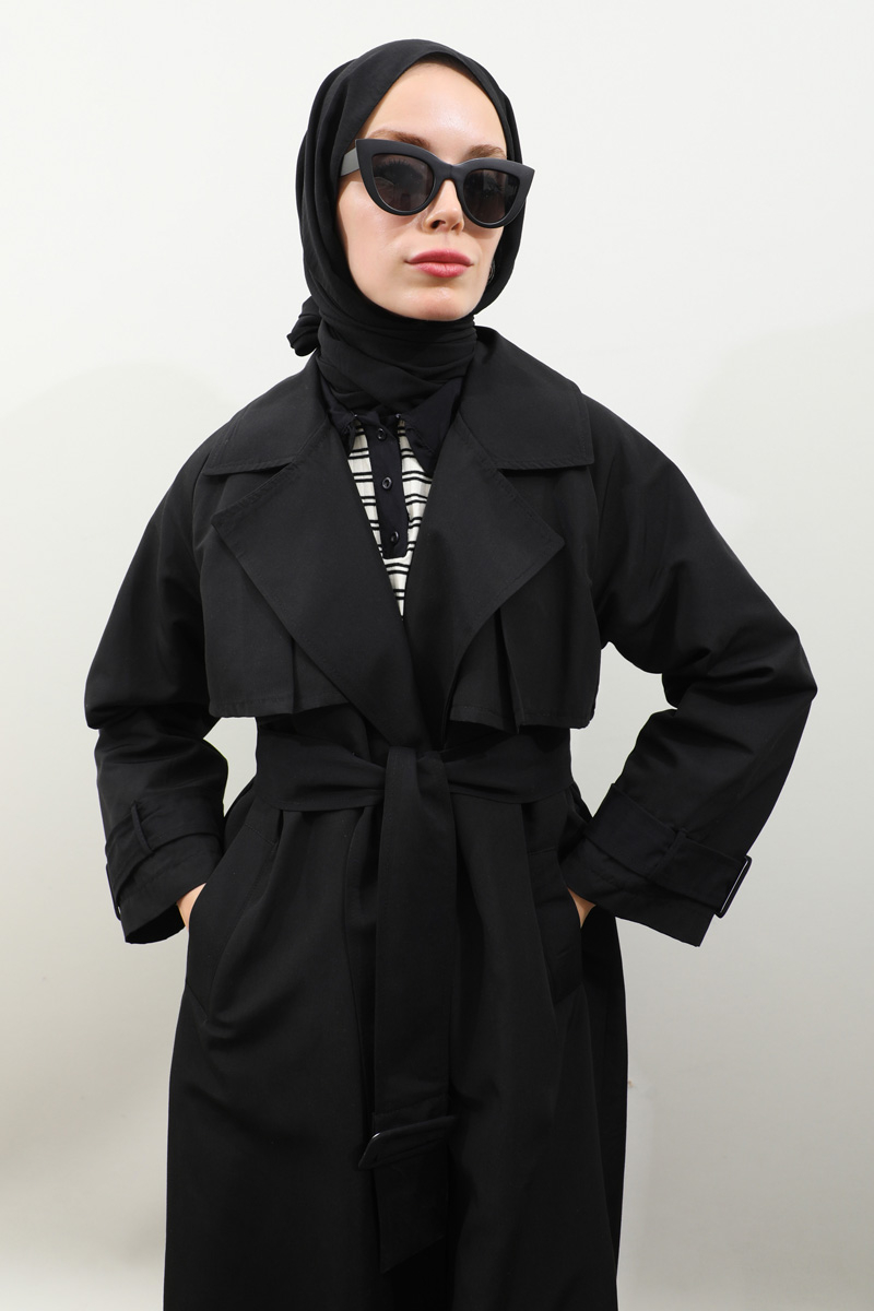 Pile Detay Trençkot Siyah