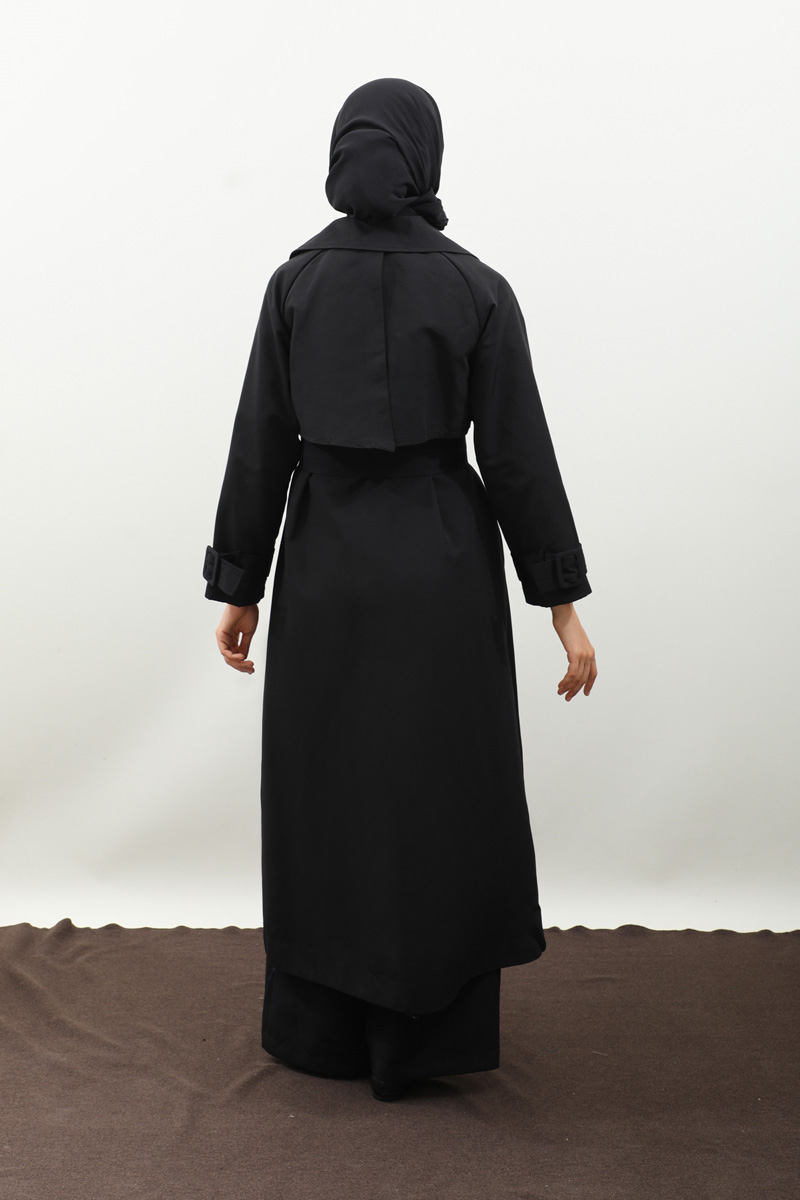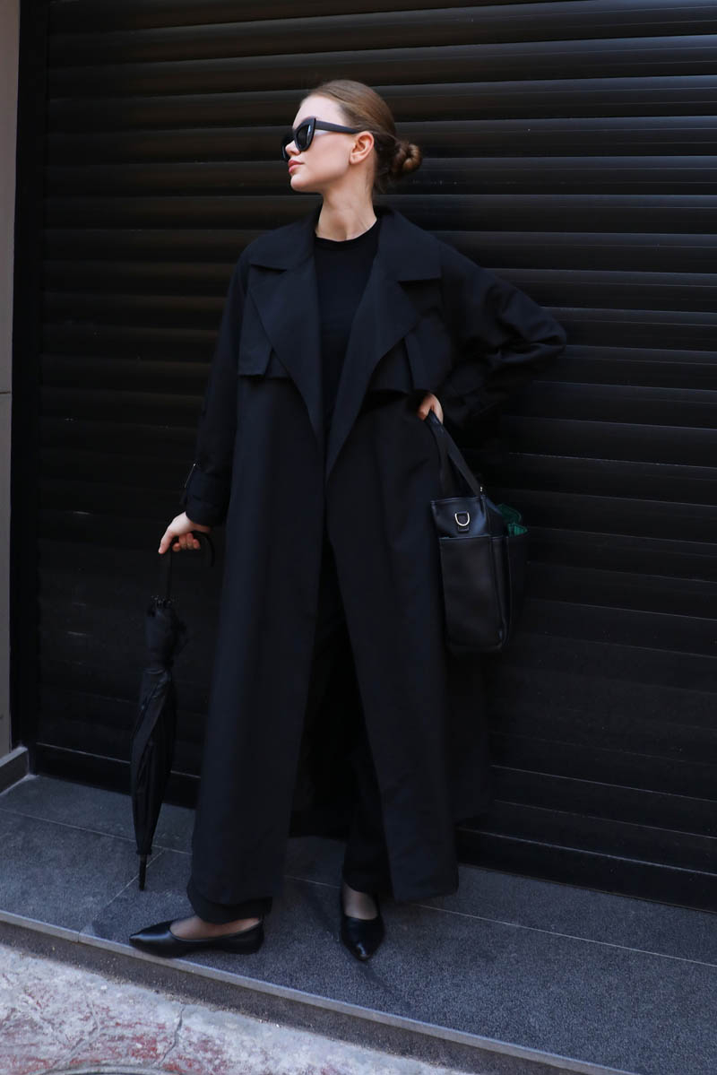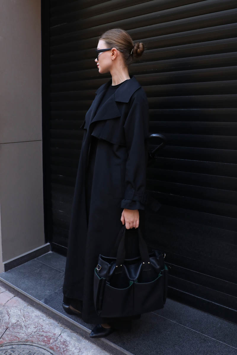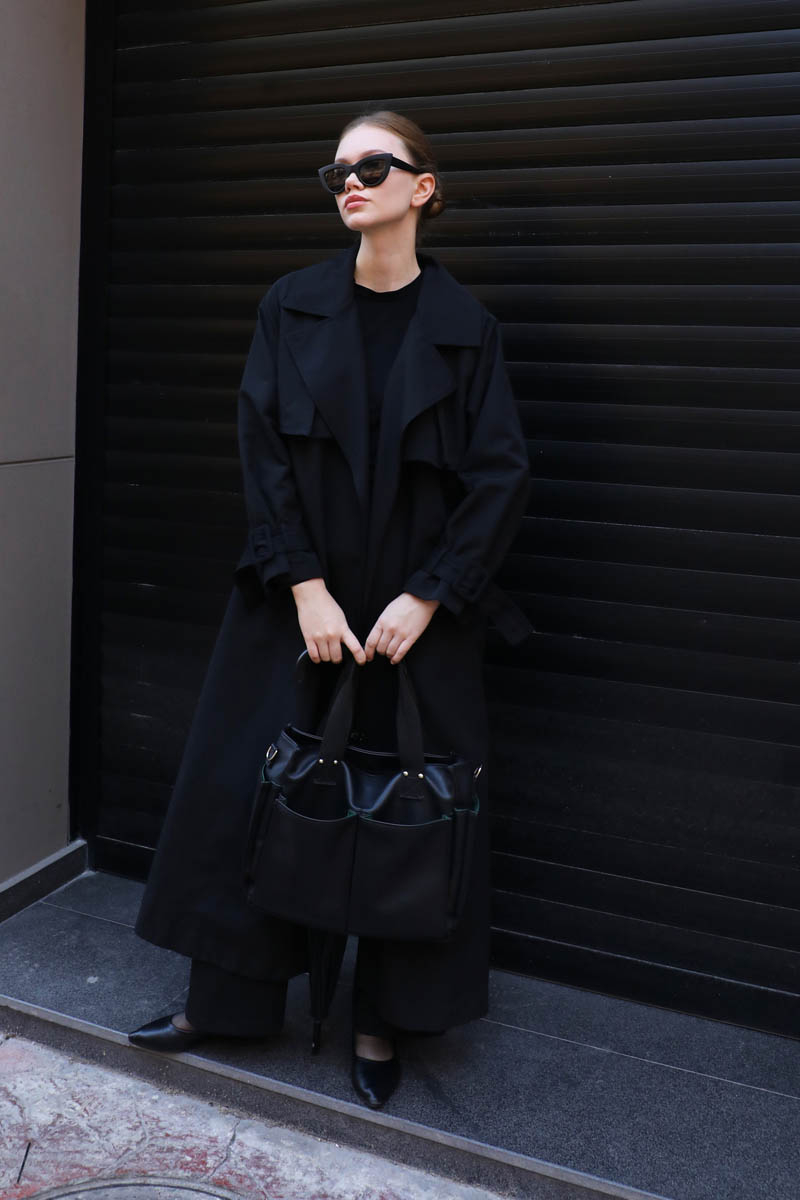 Pile Detay Trençkot Siyah