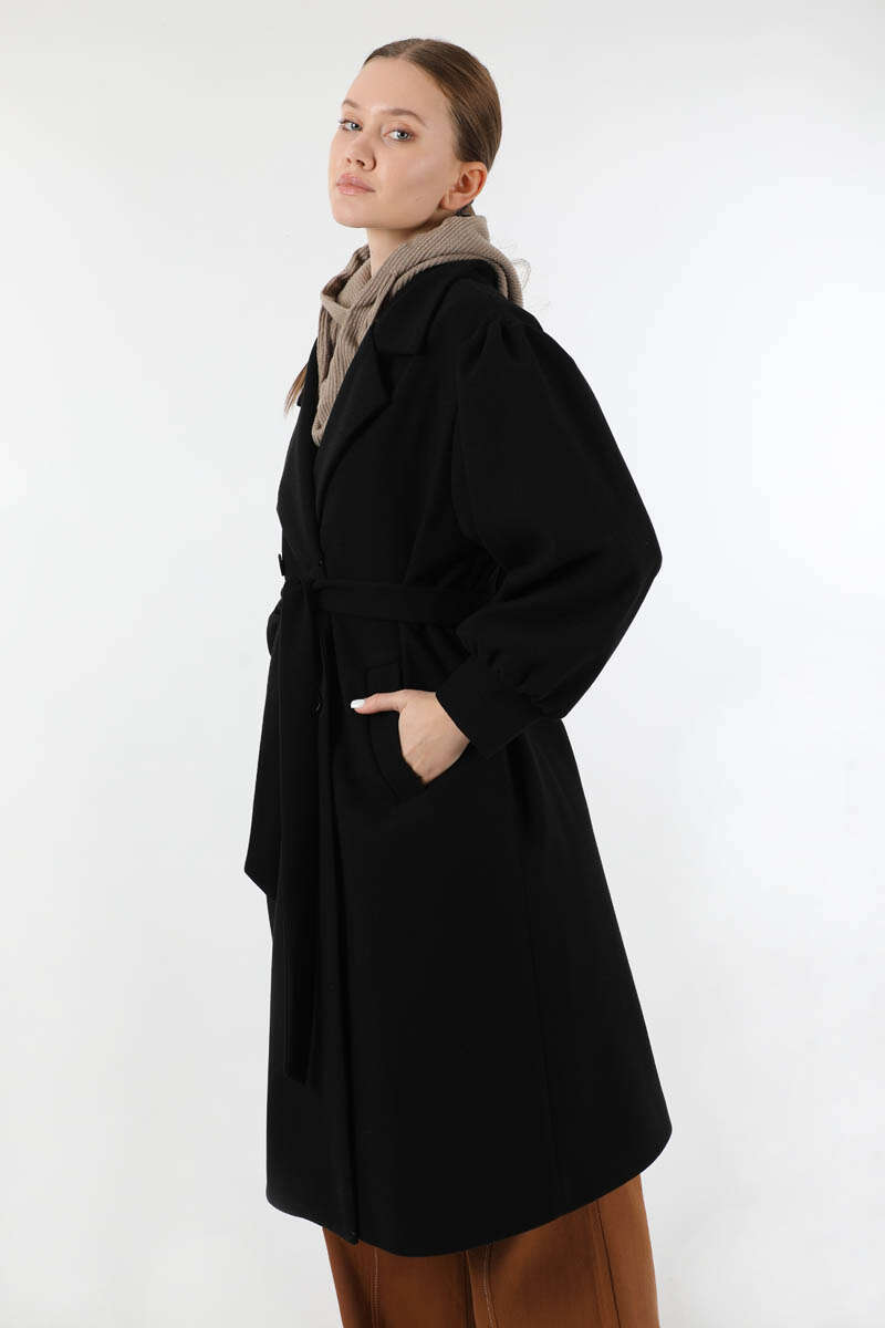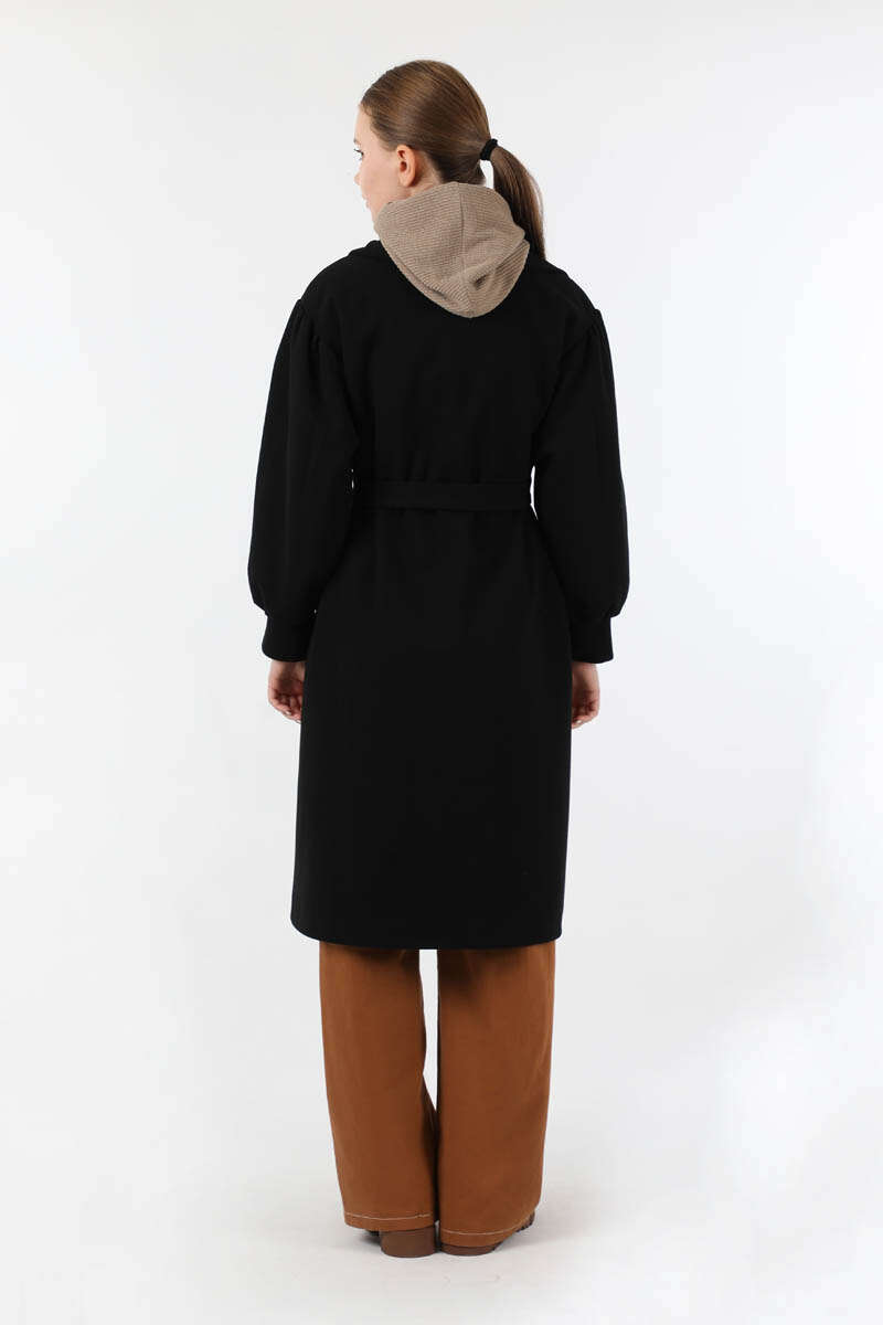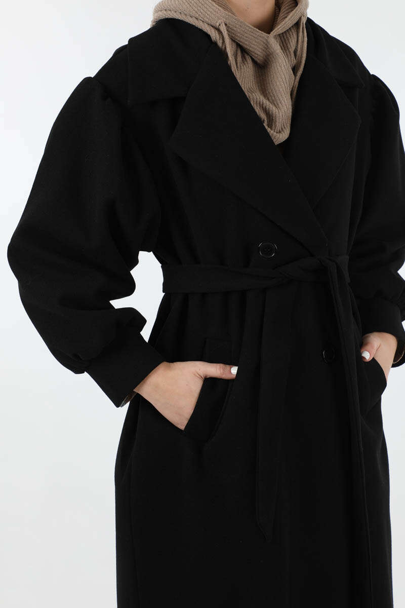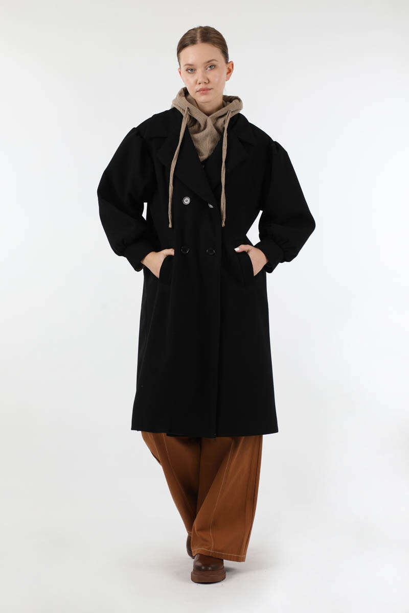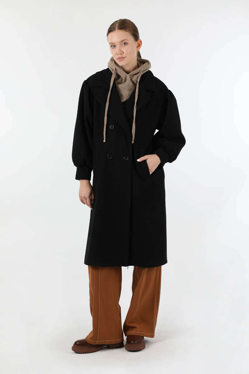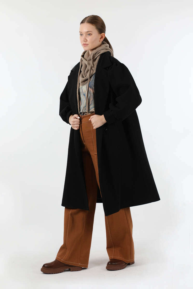 Pile Detaylı Ceket Yaka Kaban Siyah