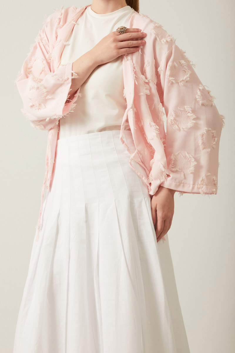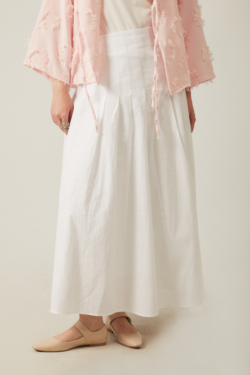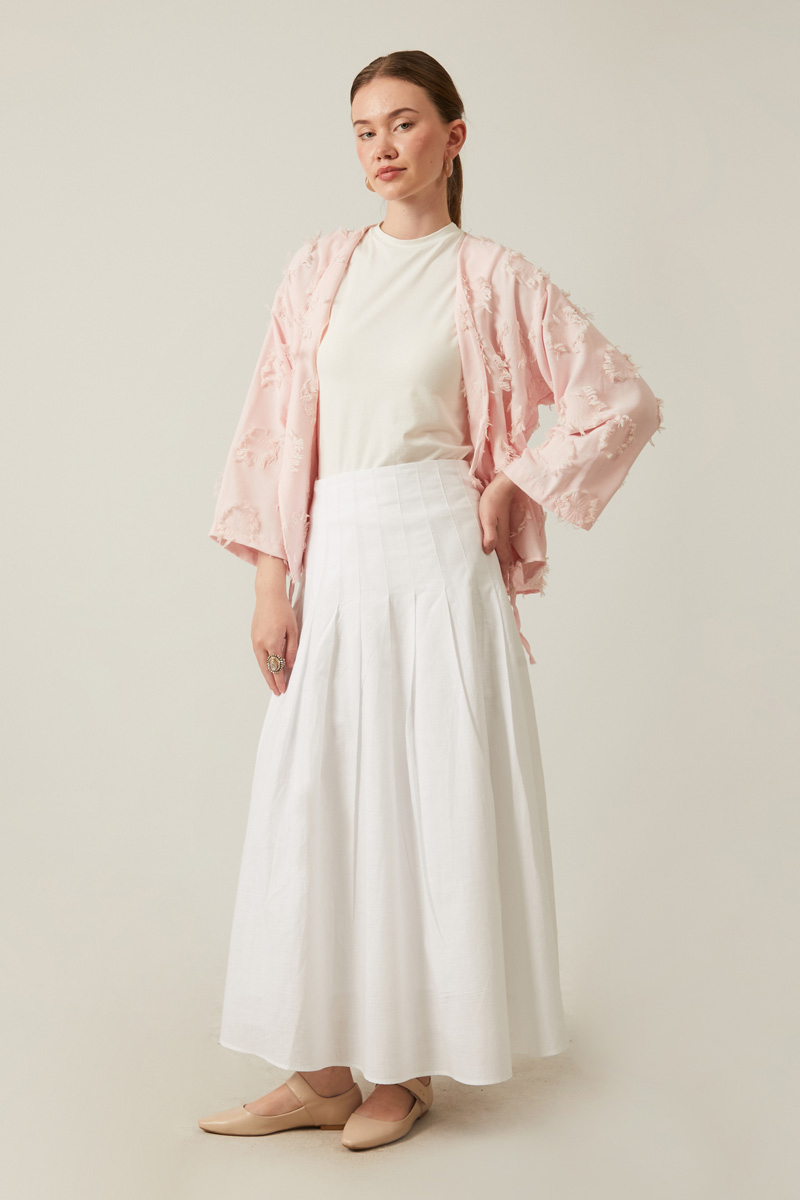 Pile Detaylı Etek Beyaz, Dökümlü ve hafif kumaşı, eteğin bedende zarifçe akmasını sağlar. Geniş ve düzgün pilileri, eteğe hem hacim hem de hareket katarken, rahat bir siluet oluşturur. Sade ve zamansız tasarımı sayesinde çeşitli üst giysilerle kolayca kombinlenebilir.