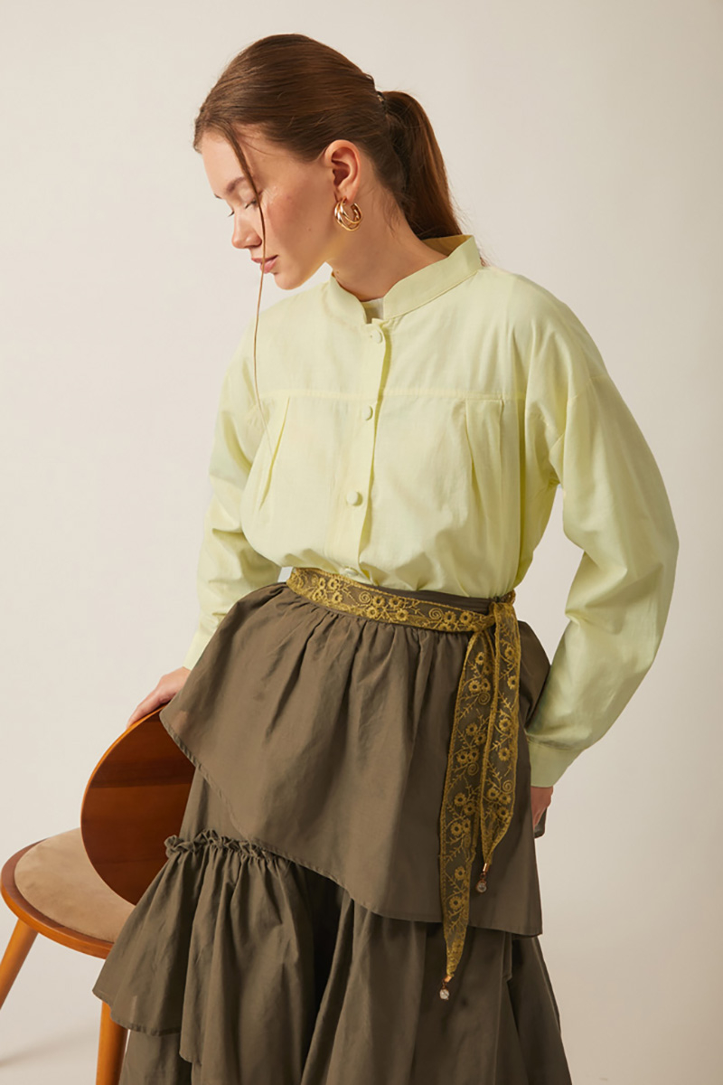 Pile Detaylı Keten Gömlek Tereyağı Sarısı