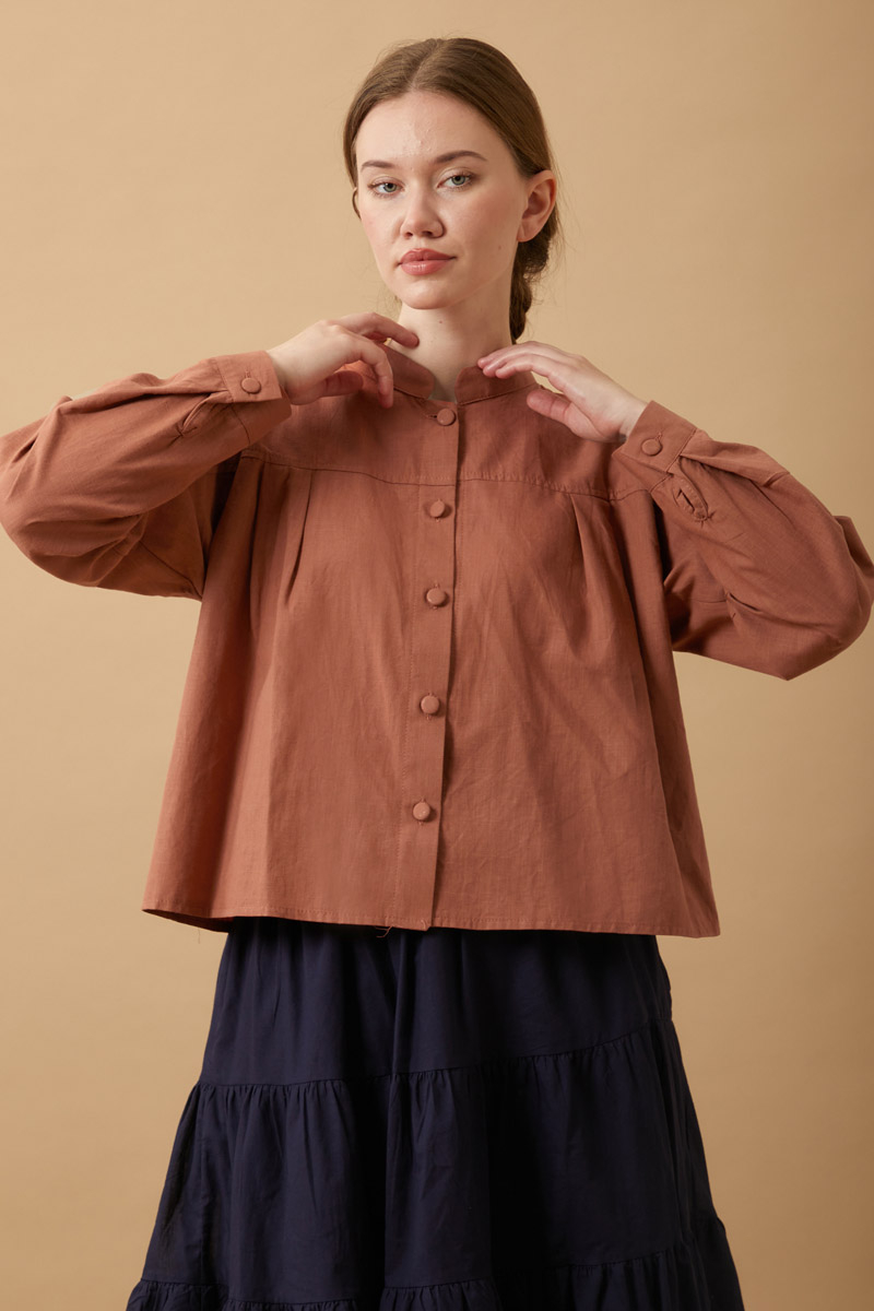 Pile Detaylı Kısa Gömlek Gül Kurusu, Oversize kesimli düğmeli gömlek, hakim yaka detayıyla zarif bir görünüm sunarken; kat detaylı maxi etek kombine hareket ve hacim kazandırır.