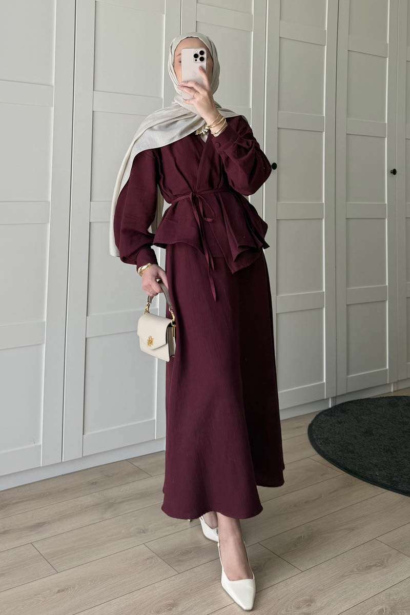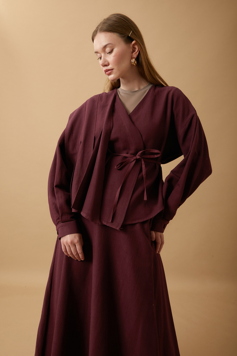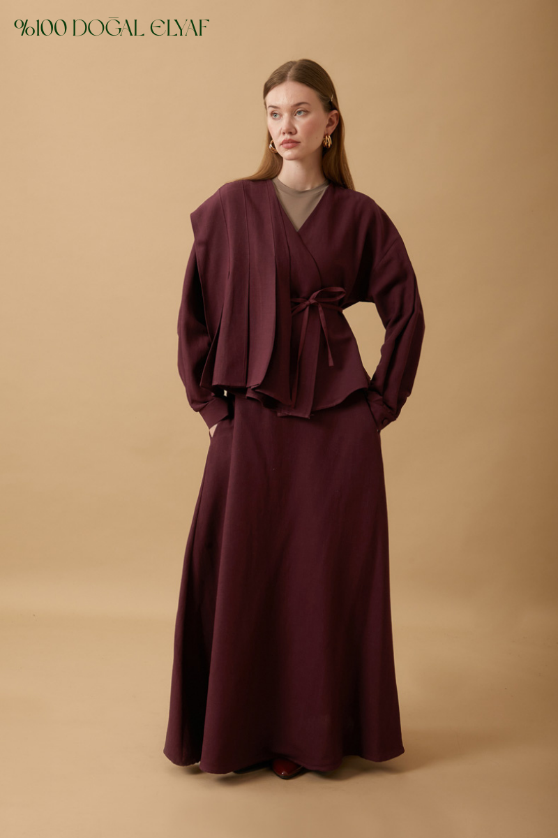 The asymmetrical pleated top adds a modern edge to the design, while the flowy long skirt offers freedom of movement and all-day comfort.