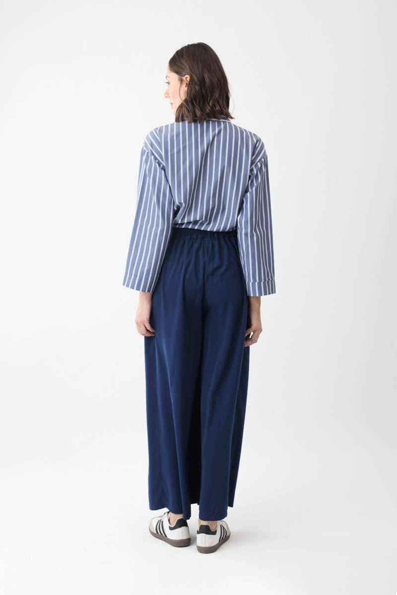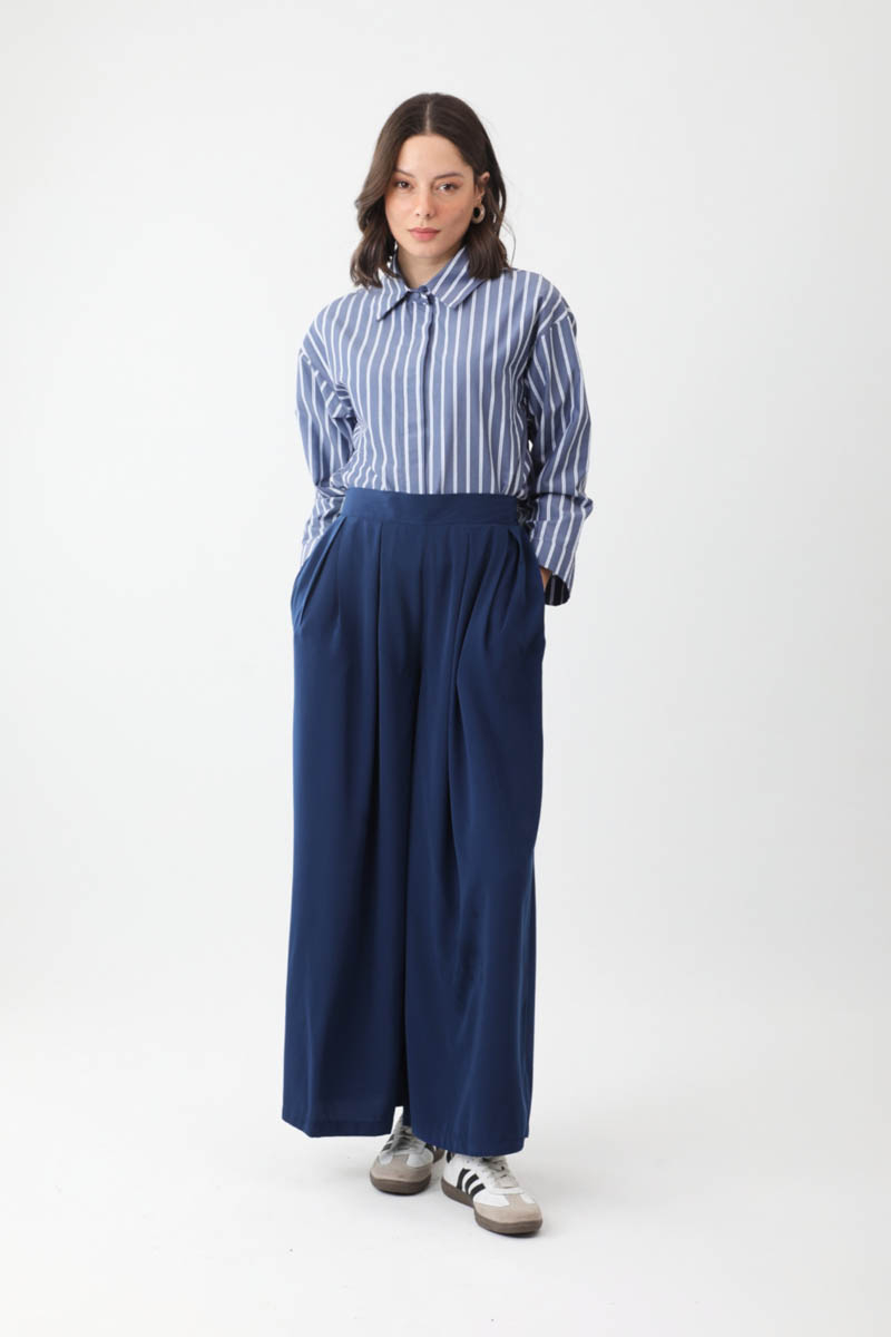 Pileli Bol Paça Pantolon Lacivert. Önden pilelidir, yandan ceplidir, bol kalıp ve bol paçadır, arka bel lastiklidir, fermuarsız ve düğmesizdir. Günlük kullanım için uygundur.