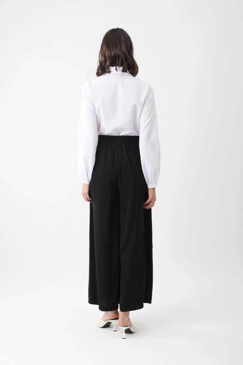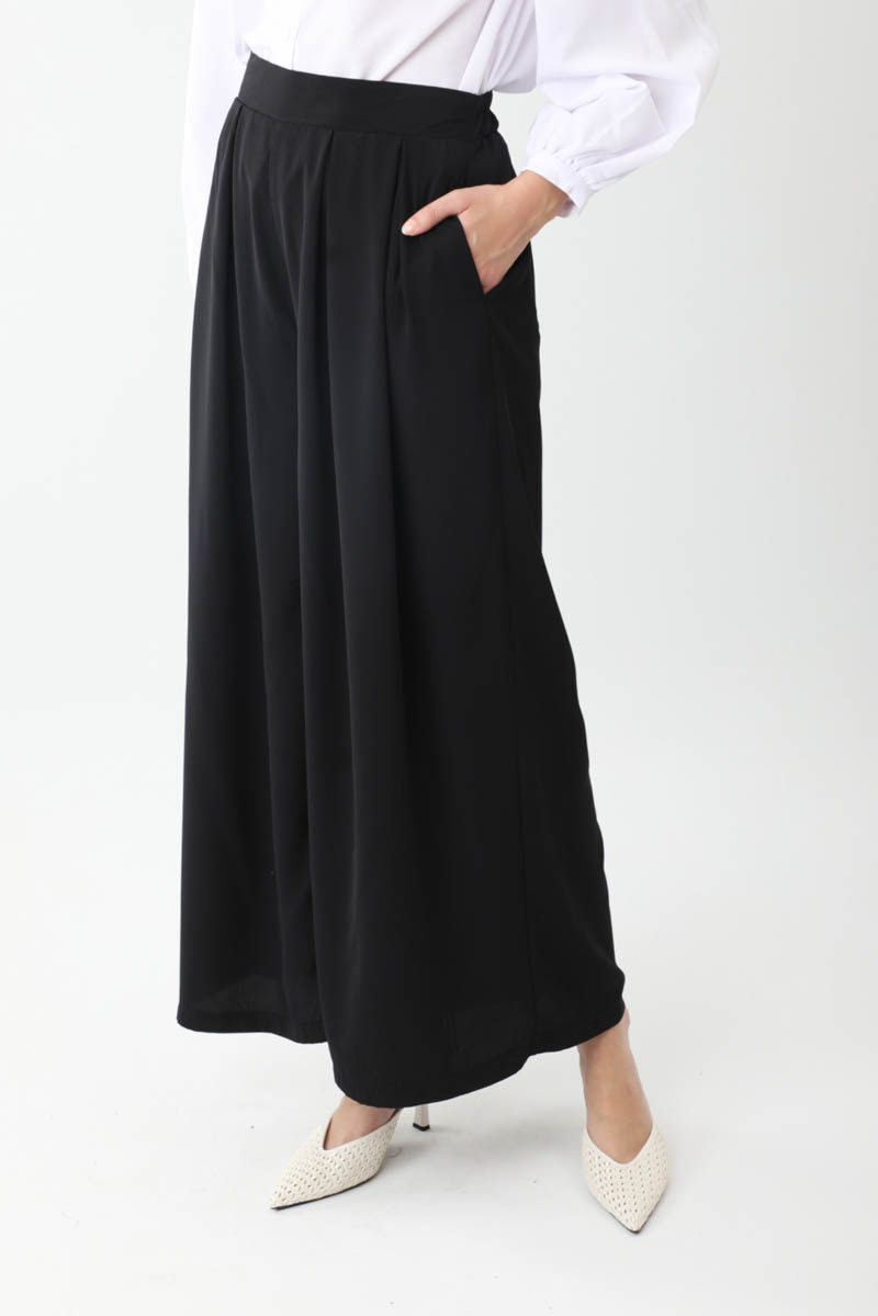 Pileli Bol Paça Pantolon Siyah. Önden pilelidir, yandan ceplidir, bol kalıp ve bol paçadır, arka bel lastiklidir, fermuarsız ve düğmesizdir. Günlük kullanım için uygundur.