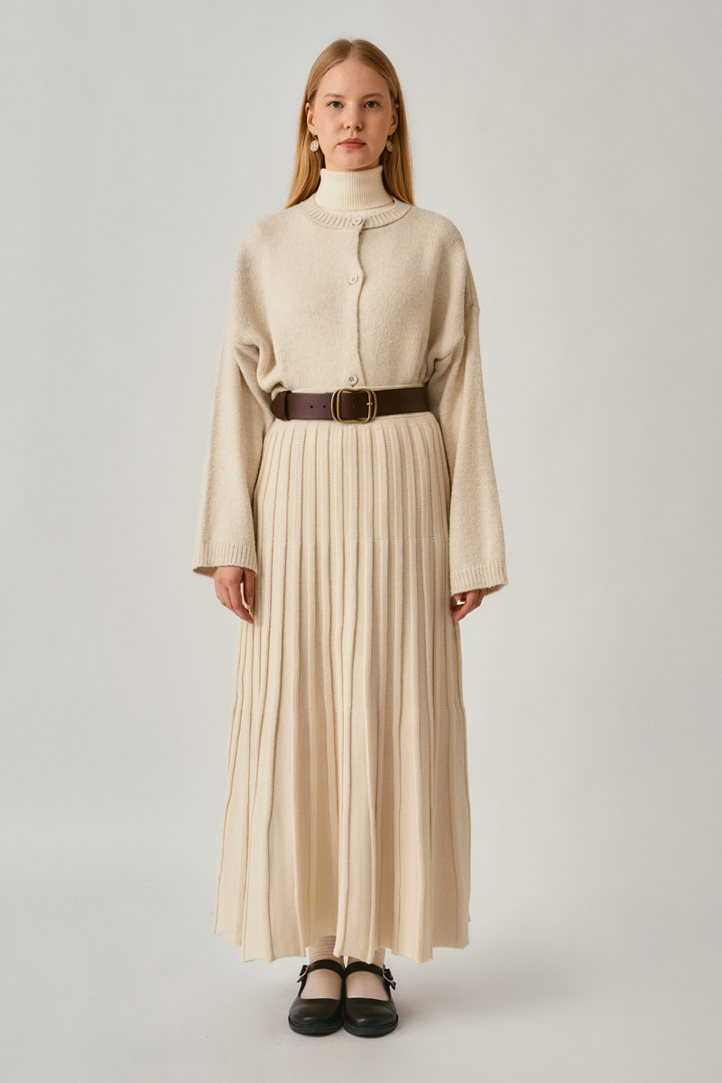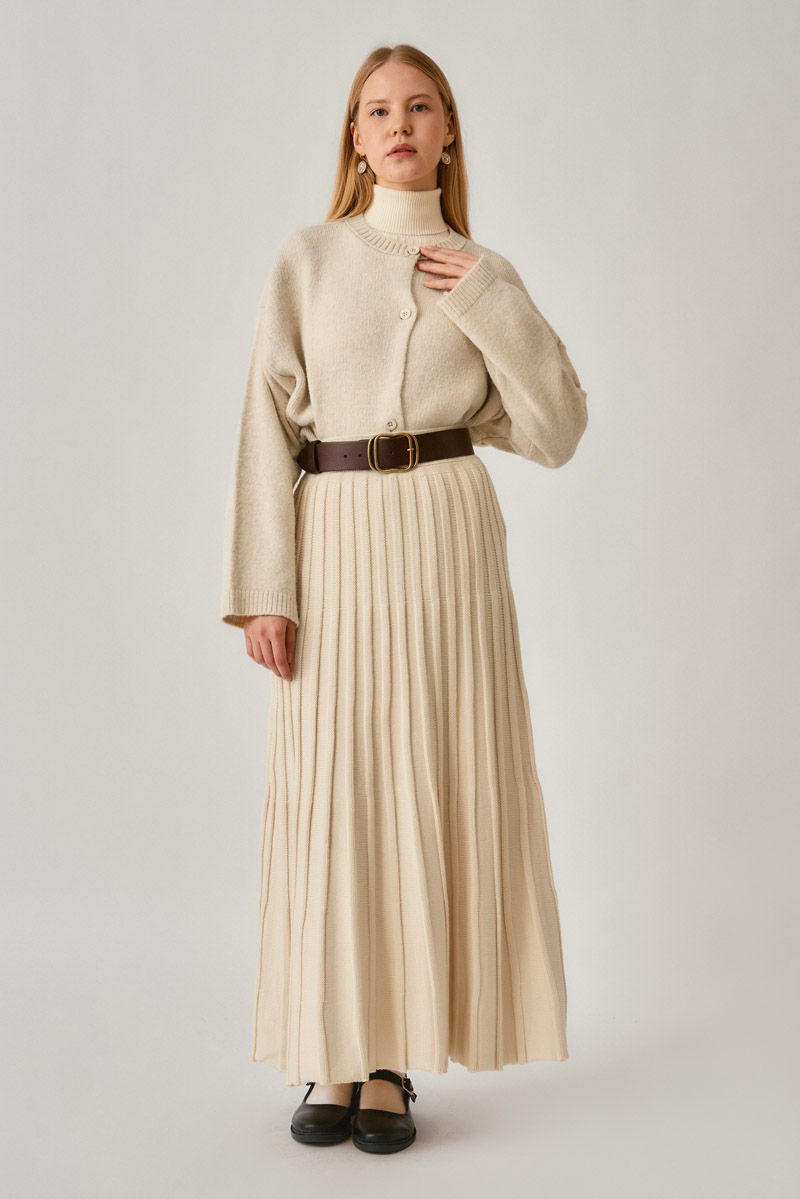 Pileli Triko Etek Ekru, yumuşacık dokusu ve akıcı formuyla kış sezonunun en rahat parçalarından biri. Dikey pile deseniyle zarif bir siluet oluştururken, esnek beli sayesinde gün boyu konfor sağlar. Kalın triko dokusu sıcak tutar, klasik ve modern kombinlere kolayca uyum sağlar. Kazaklar, gömlekler veya hırkalarla birlikte sezonun favori görünümünü oluşturabilirsiniz.