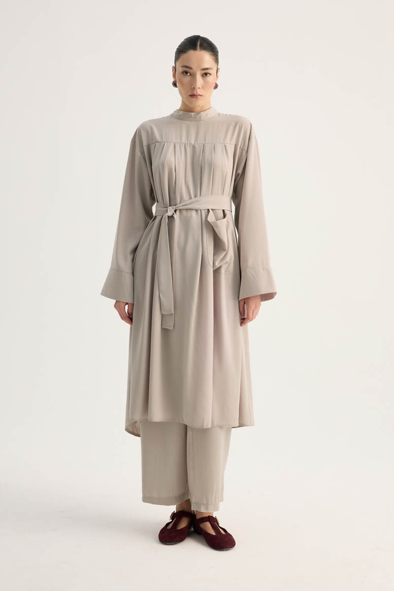Pileli Tunik Takım Taş. Hakim yakadır, önden robalı ve pile detaylıdır, düşük omuzludur, geniş manşetlidir, torba cep detaylıdır, kuşaklıdır, Pantolon arka beli lastiklidir yandan ceplidir, önden fermuarlı tek düğmelidir. Günlük kullanım ve özel günlerinizde tercih edebilirsiniz.