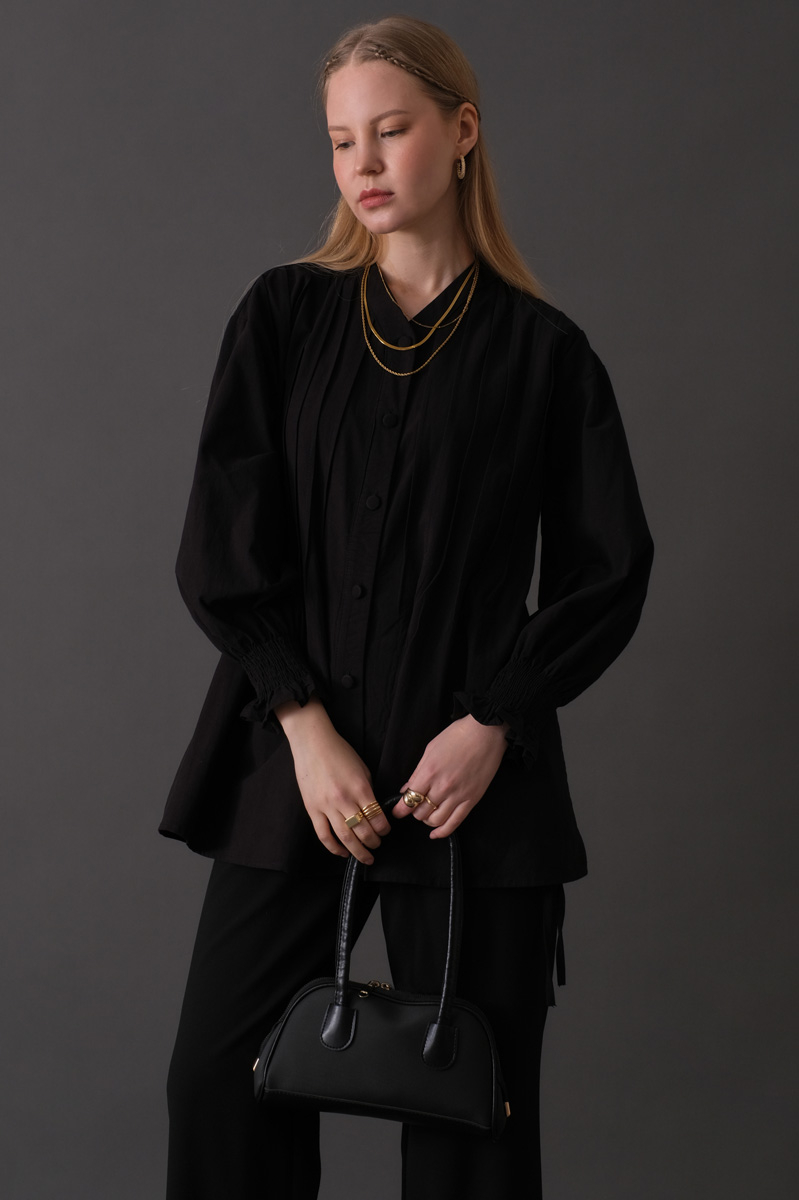 Pin-Tuck Cotton Shirt Black brings together a modern and elegant look with ease. The fine pintuck details on the front add movement and character, while the soft cotton fabric offers all-day comfort. The shirred elastic cuffs create a feminine sleeve silhouette, and its long, relaxed cut makes it suitable for both everyday and office outfits.