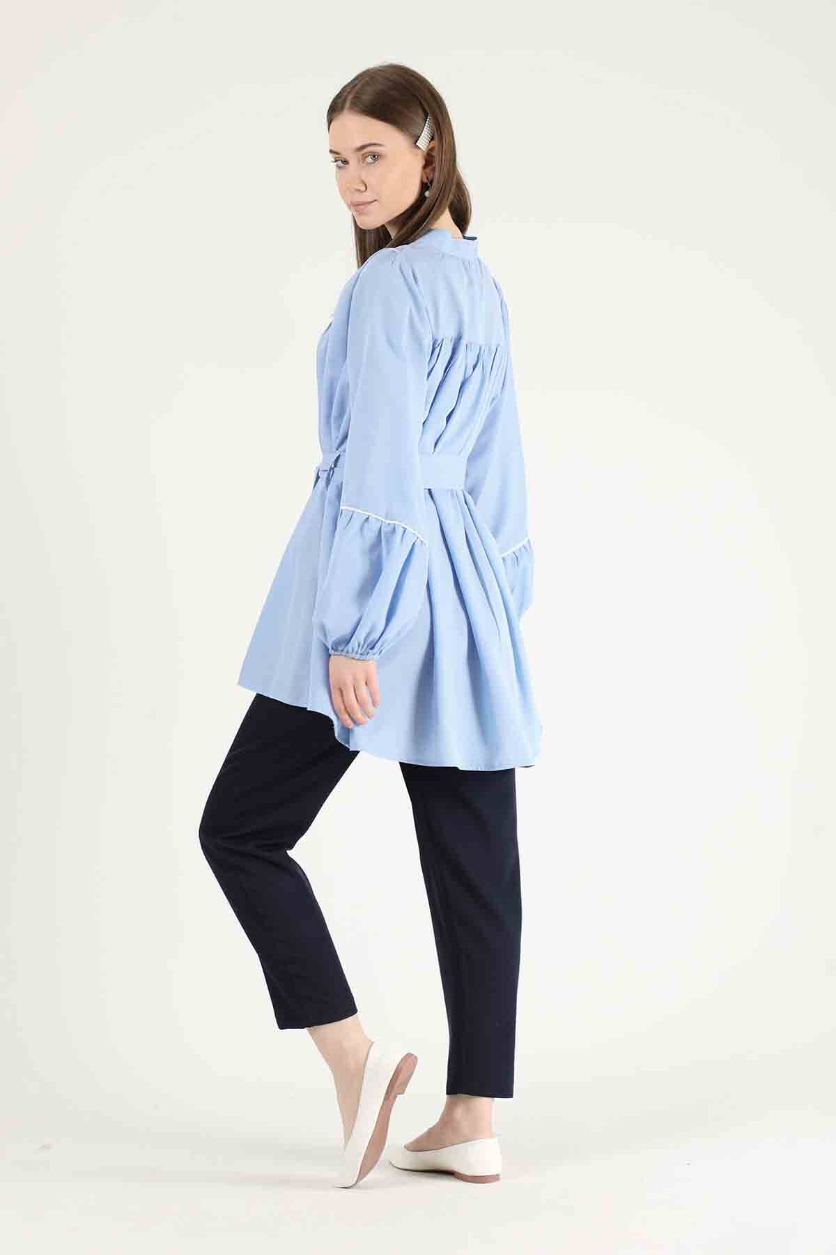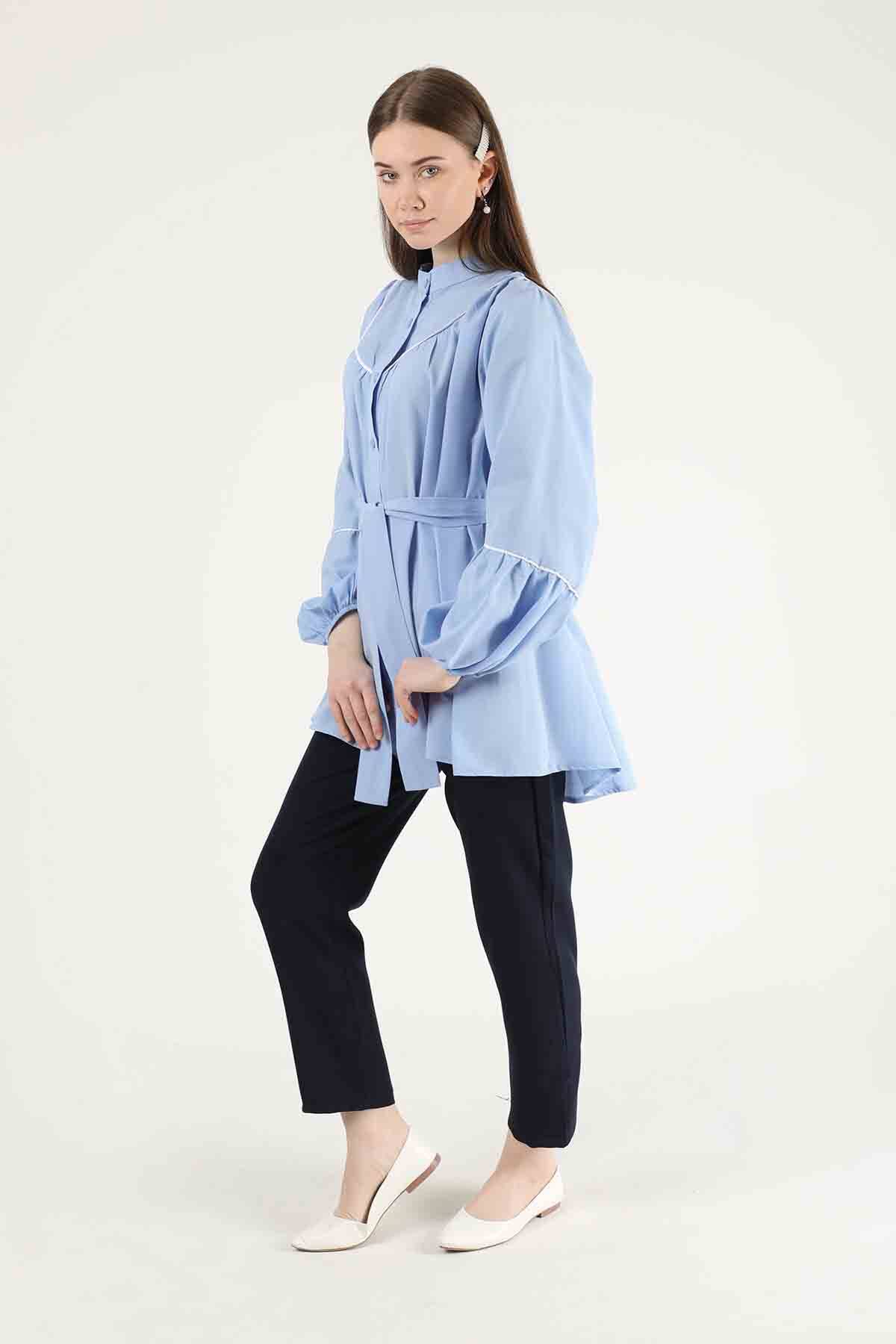 Piping Detail Belted Shirt Baby Blue. It is belted. The sleeves and collar are piping. The cuff is elastic. The front is shirred. It is upright. You can choose it for your daily use and special days.