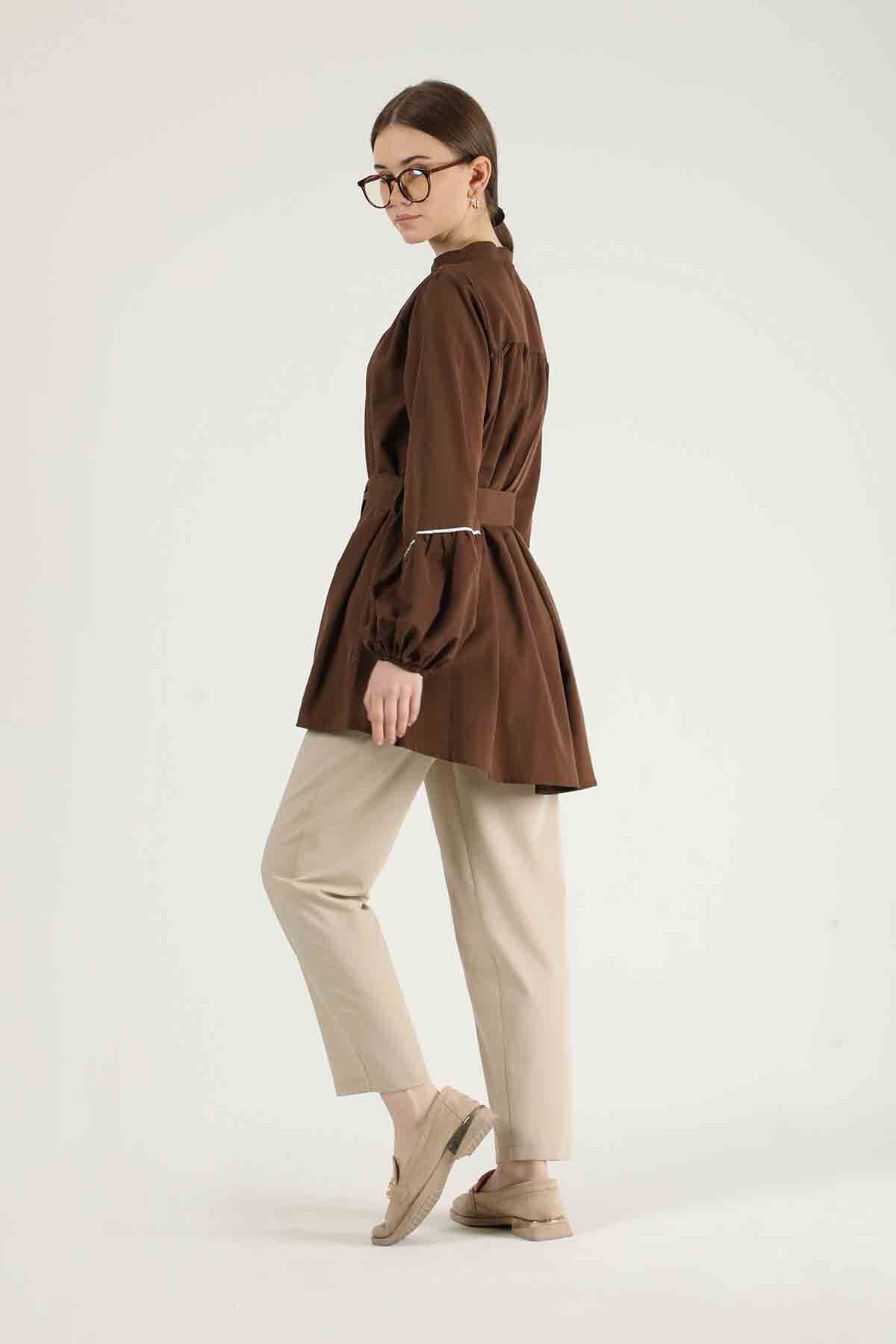 Piping Detail Belted Shirt Brown. It is belted. The sleeves and collar are piping. The cuff is elastic. The front is shirred. It is upright. You can choose it for your daily use and special days.