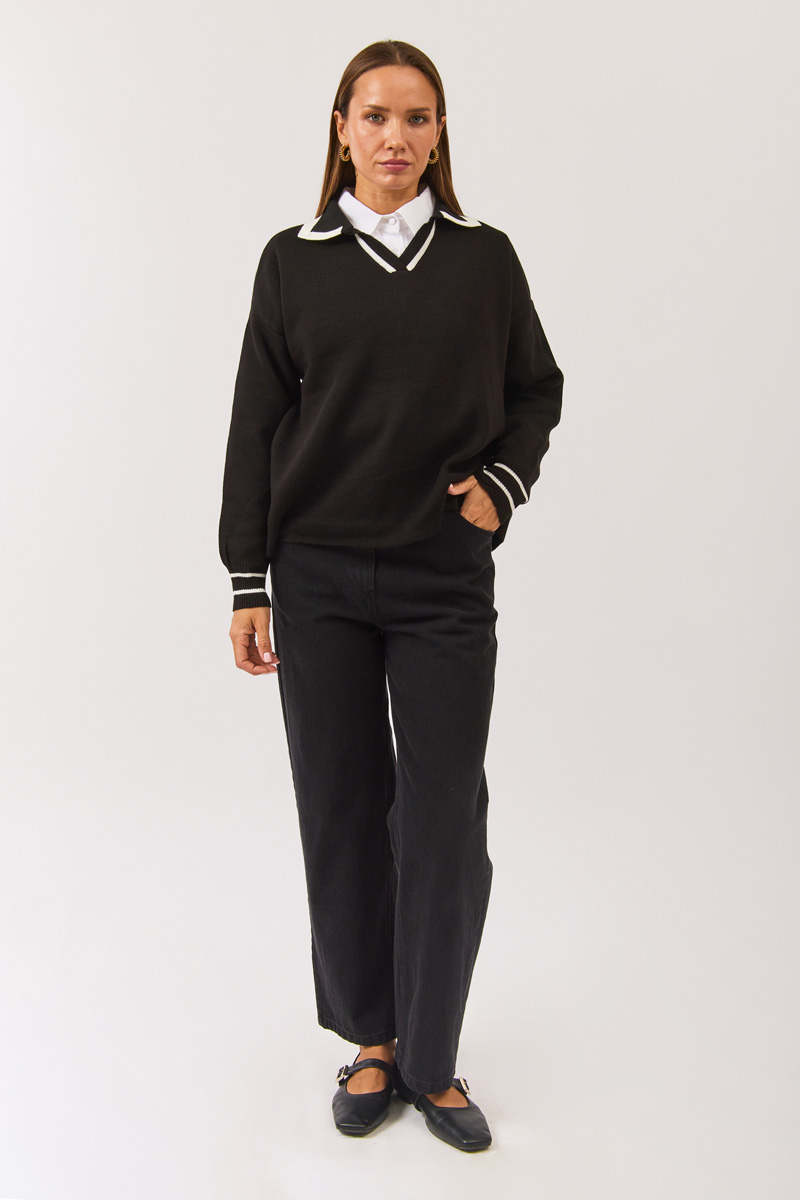 With its simple design and sporty details, this sweater is the perfect energetic finishing touch for everyday outfits. The polo collar and contrasting striped cuffs add a modern twist to a classic style. Crafted from soft knit fabric, it offers all-day comfort and pairs effortlessly with jeans, skirts, or tailored trousers — making it a versatile wardrobe staple.