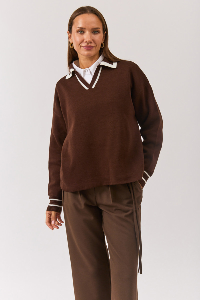 Plain Polo Sweater Brown With its simple design and sporty details, this sweater is the perfect energetic finishing touch for everyday outfits. The polo collar and contrasting striped cuffs add a modern twist to a classic style. Crafted from soft knit fabric, it offers all-day comfort and pairs effortlessly with jeans, skirts, or tailored trousers — making it a versatile wardrobe staple.