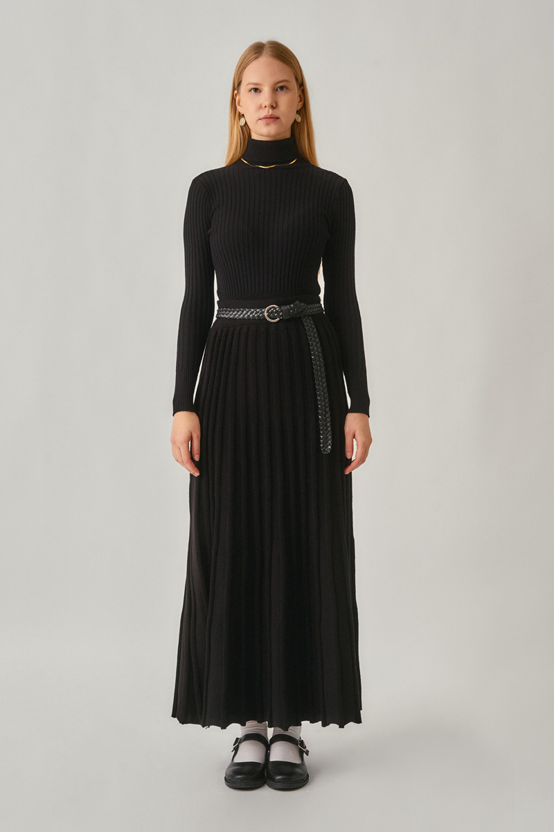 Pleated Knit Skirt Black is one of the coziest pieces of the winter season, featuring a soft texture and fluid form. The vertical pleat design creates an elegant silhouette, while the elastic waistband ensures all-day comfort. Its thick knit texture provides warmth and pairs easily with both classic and modern outfits. Combine it with sweaters, shirts, or cardigans to create your favorite seasonal look.