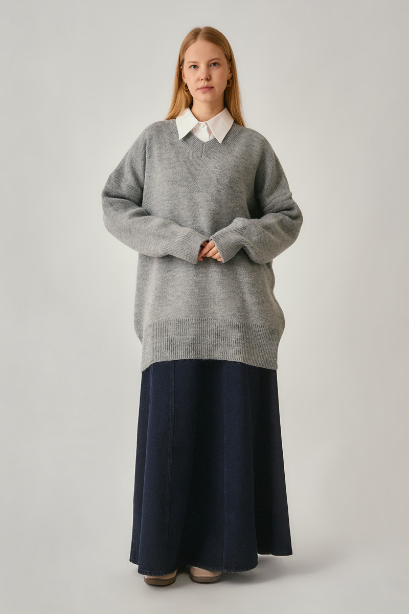 The Knit Sweater with V-Neck combines a clean line with a modern silhouette. Its soft knit texture and relaxed fit provide comfort throughout the day, while the oversized form creates a timeless look. Pair it with classic white shirts or denim pieces for an effortless style. A versatile piece suitable for both daily city wear and office looks.