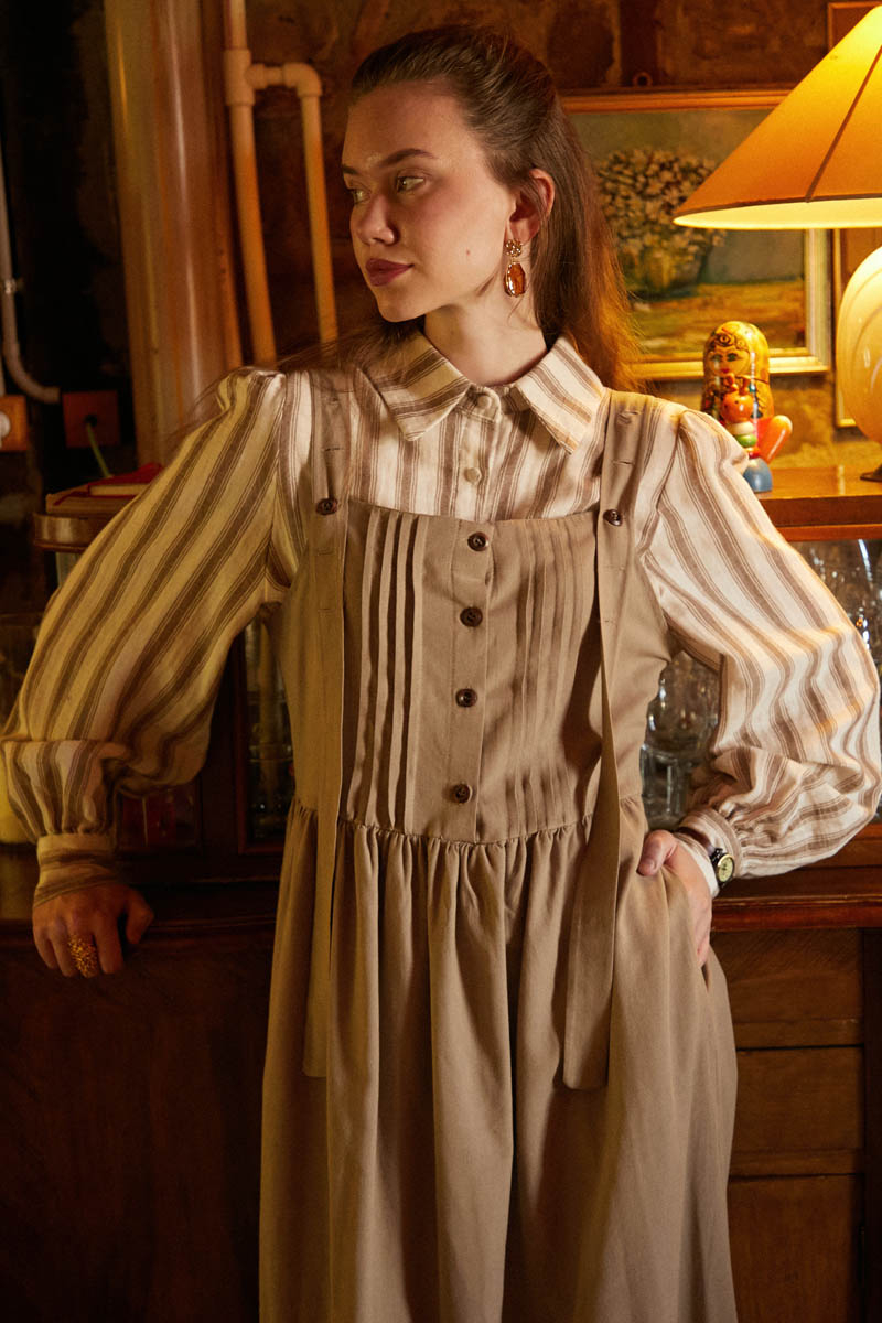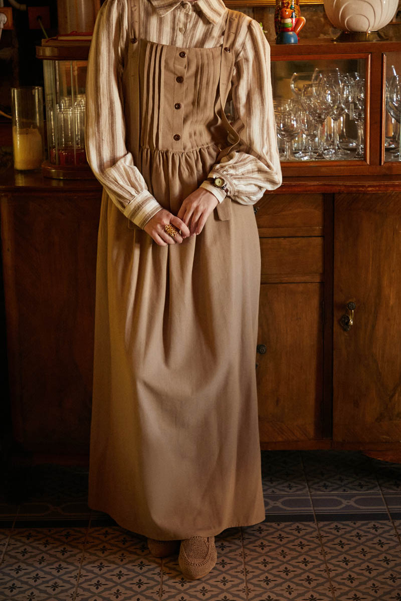 Designed with the unique texture of natural linen, this pleated pinafore dress brings together elegance and comfort. Thanks to its breathable fabric, it keeps you cool even on hot summer days, offering a skin-friendly touch.