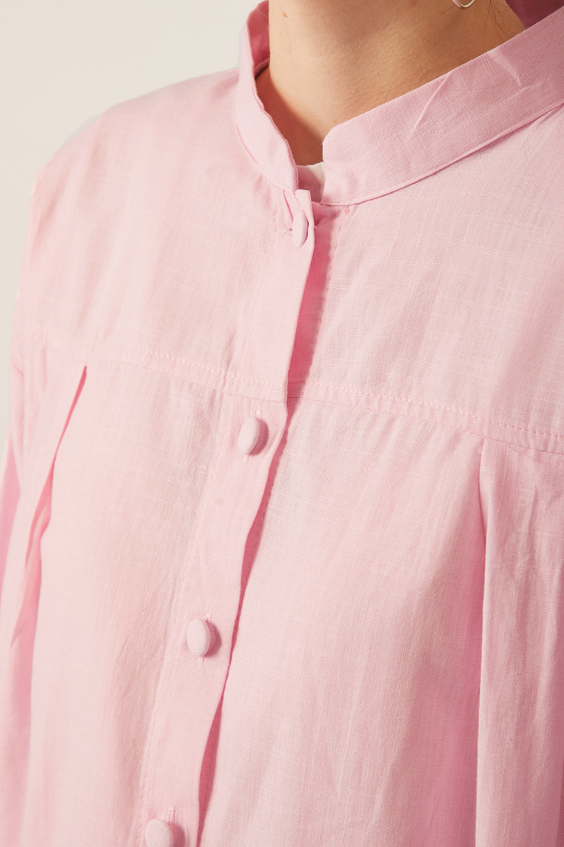 This oversized button-down shirt offers an elegant look with its yoke and pleated details and stand collar. Paired with a pleated maxi skirt, the combination adds movement and volume.