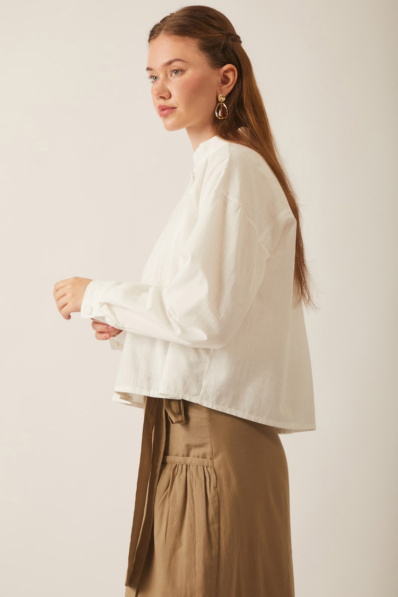 This oversized button-down shirt offers an elegant look with its yoke and pleated details and stand collar. Paired with a pleated maxi skirt, the combination adds movement and volume.