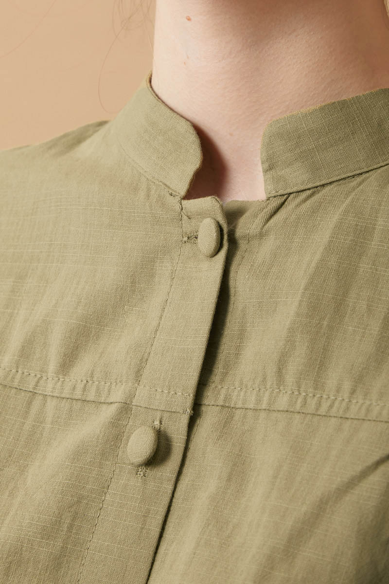 Pile Detaylı Kısa Gömlek Haki, Oversize kesimli düğmeli gömlek, hakim yaka detayıyla zarif bir görünüm sunarken; kat detaylı maxi etek kombine hareket ve hacim kazandırır.