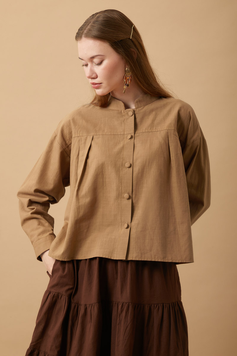 Pile Detaylı Kısa Gömlek Taba, Oversize kesimli düğmeli gömlek, hakim yaka detayıyla zarif bir görünüm sunarken; kat detaylı maxi etek kombine hareket ve hacim kazandırır.