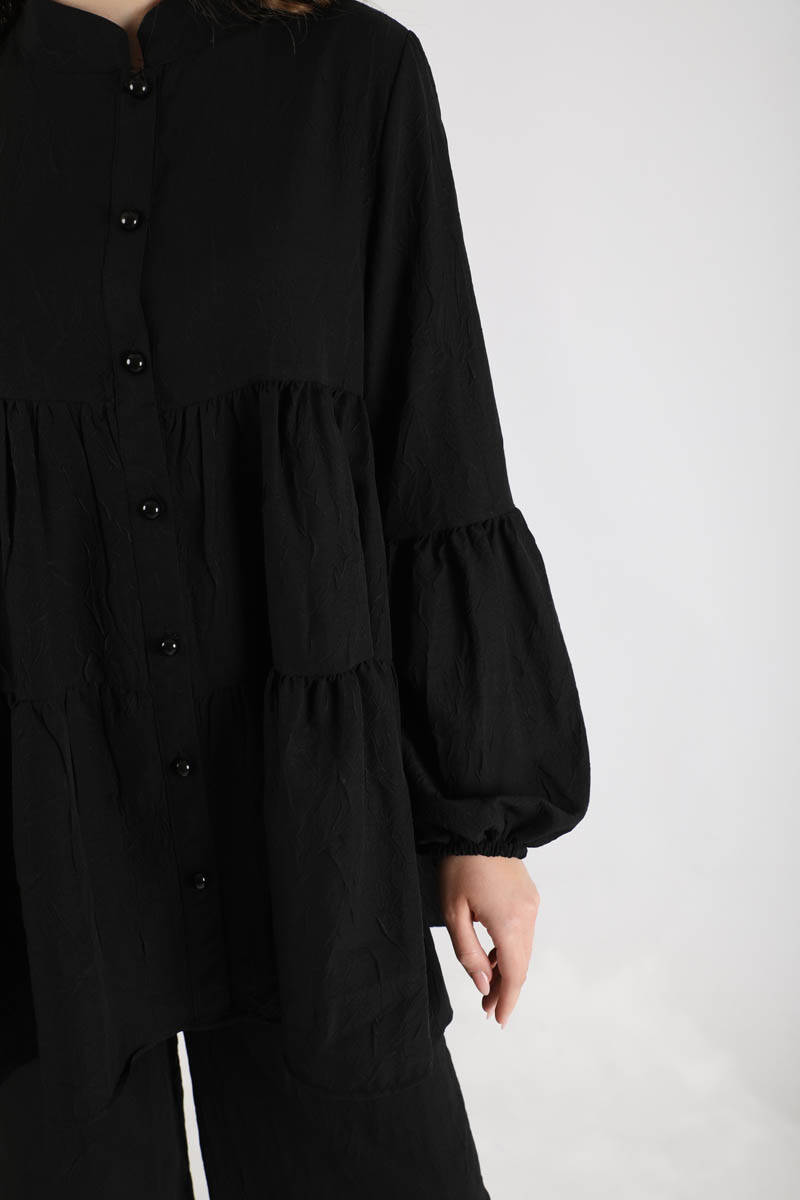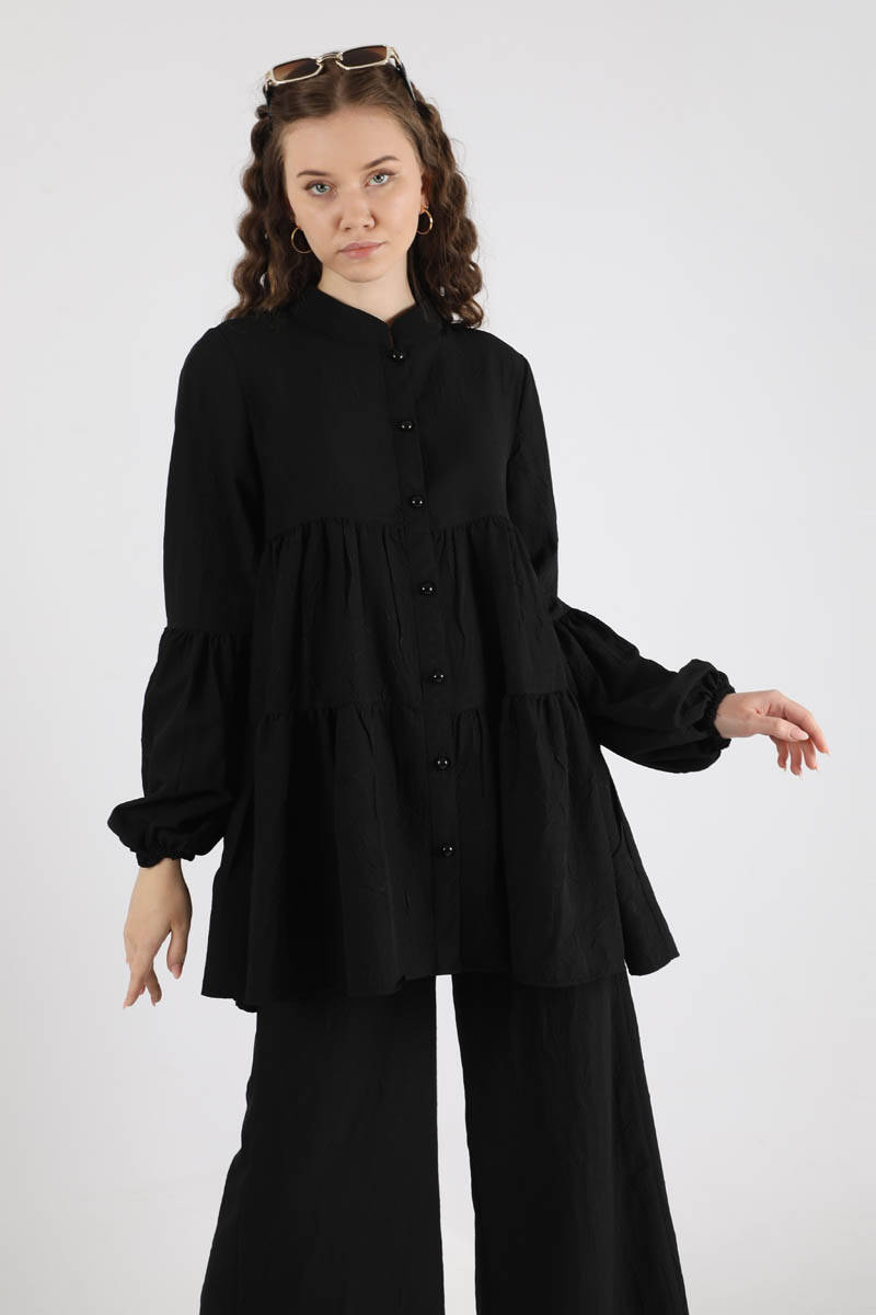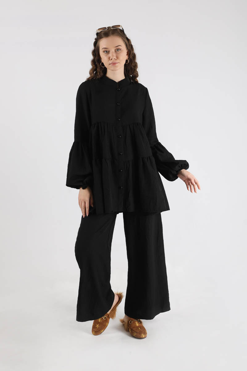 Pleated Tunic Suit Black. The trousers have elastic waist and wide leg. The tunic is ruffled and buttoned. (buttons are active). It's a normal pattern. Tunic Pants are sold as a set of two. It is the product of the new season.