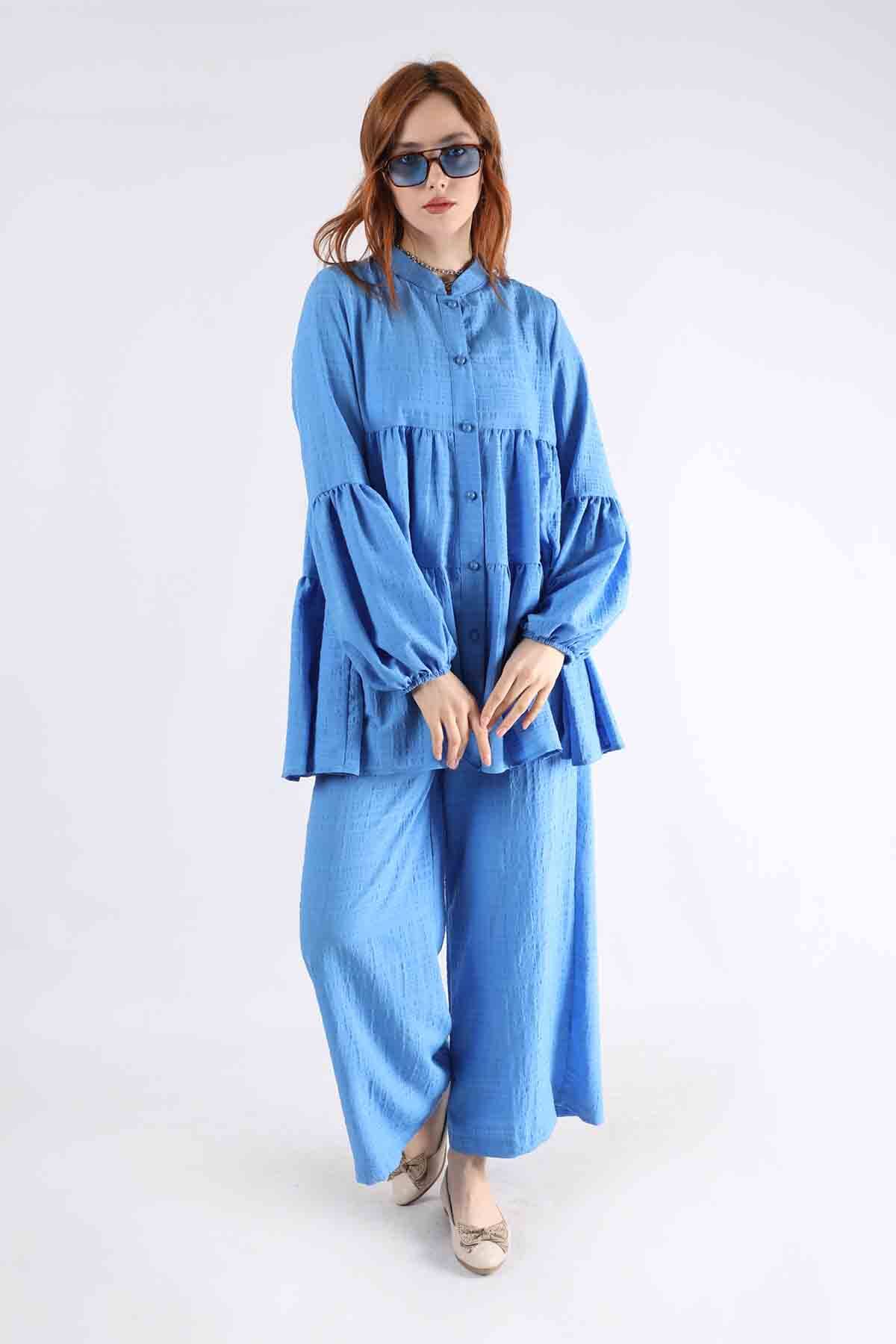 Pleated Tunic Suit Blue. The trousers have elastic waist and wide leg. The tunic is ruffled and buttoned. (buttons are active). It's a normal pattern. Tunic Pants are sold as a set of two. It is the product of the new season.