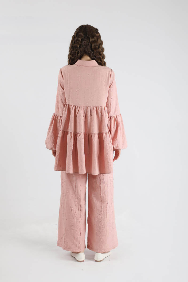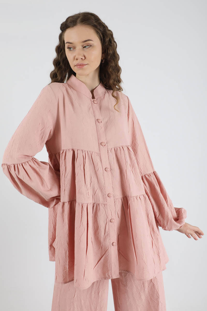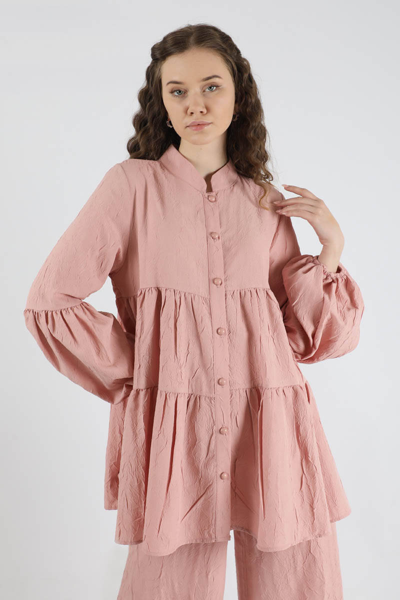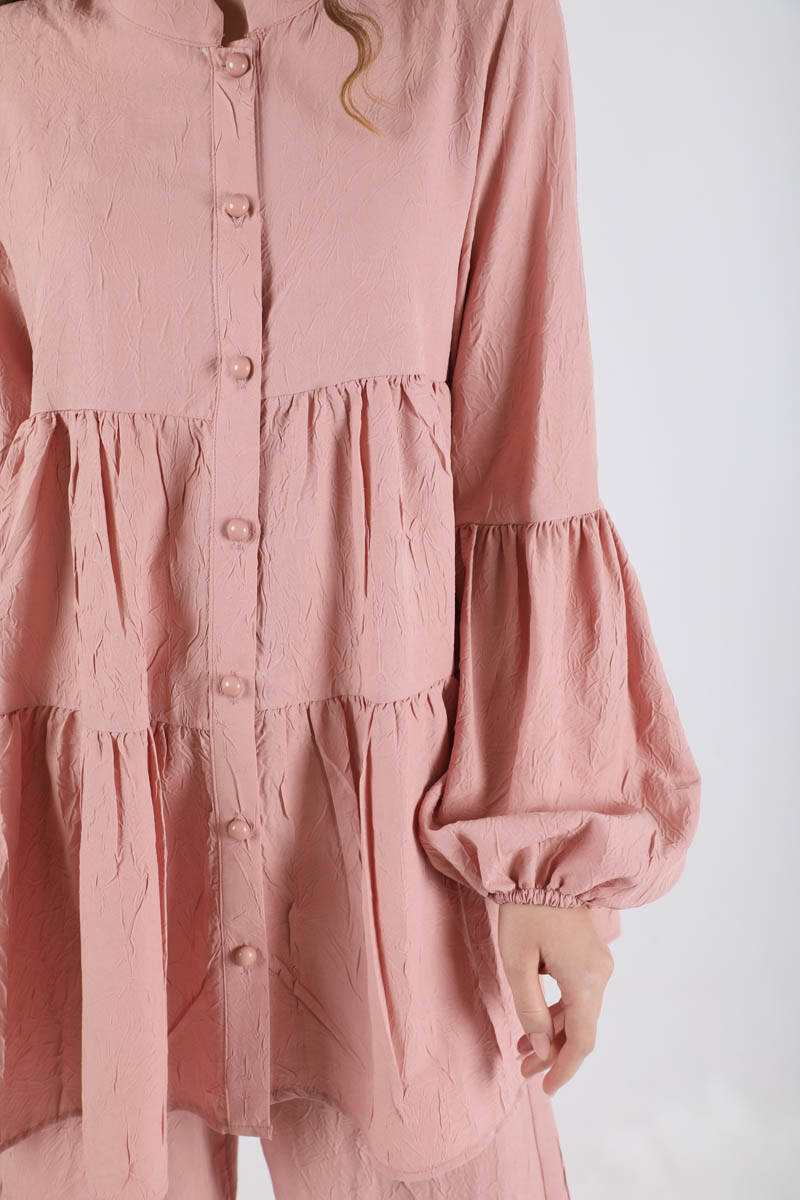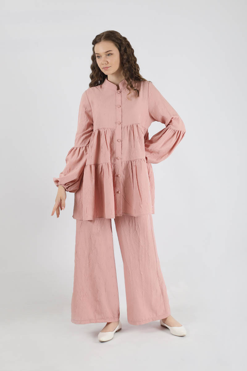 Pleated Tunic Suit Powder. The trousers have elastic waist and wide leg. The tunic is ruffled and buttoned. (buttons are active). It's a normal pattern. Tunic Pants are sold as a set of two. It is the product of the new season.