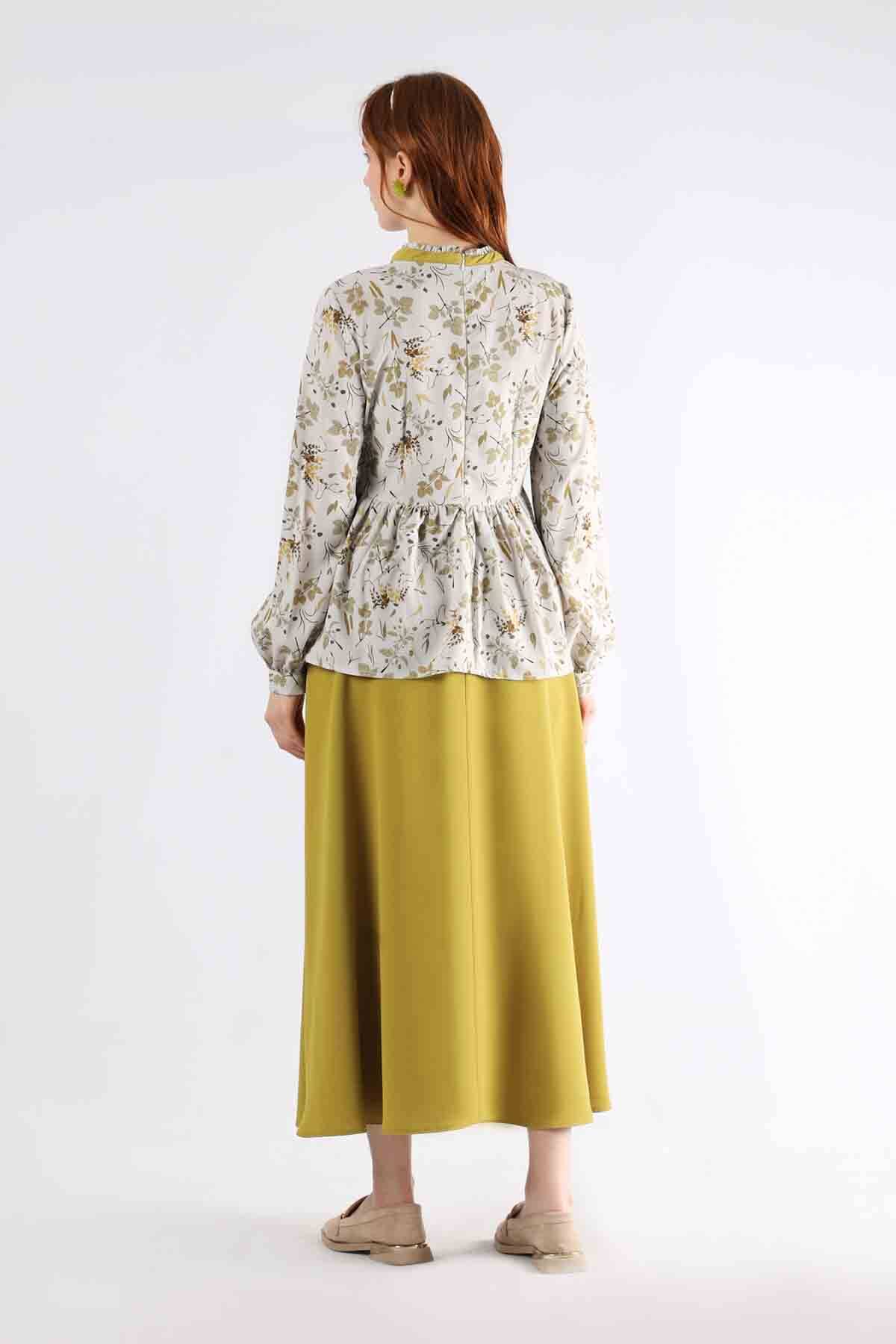 Pleated Tunic Skirt Set Oil Green. Collar has ruffle detail. The tunic has a gathered waist. The cuff should be buttoned. It has a back zipper. Skirt Waist is elastic. You can choose it on your special days.