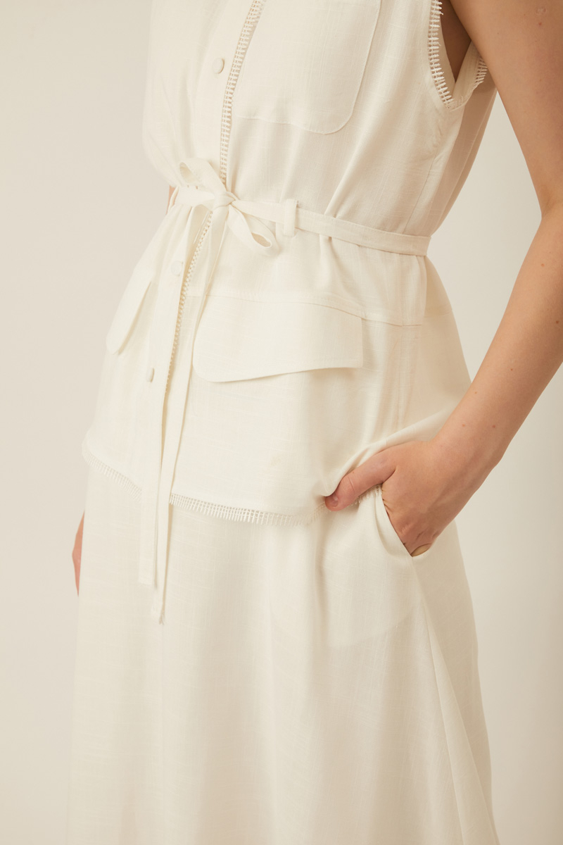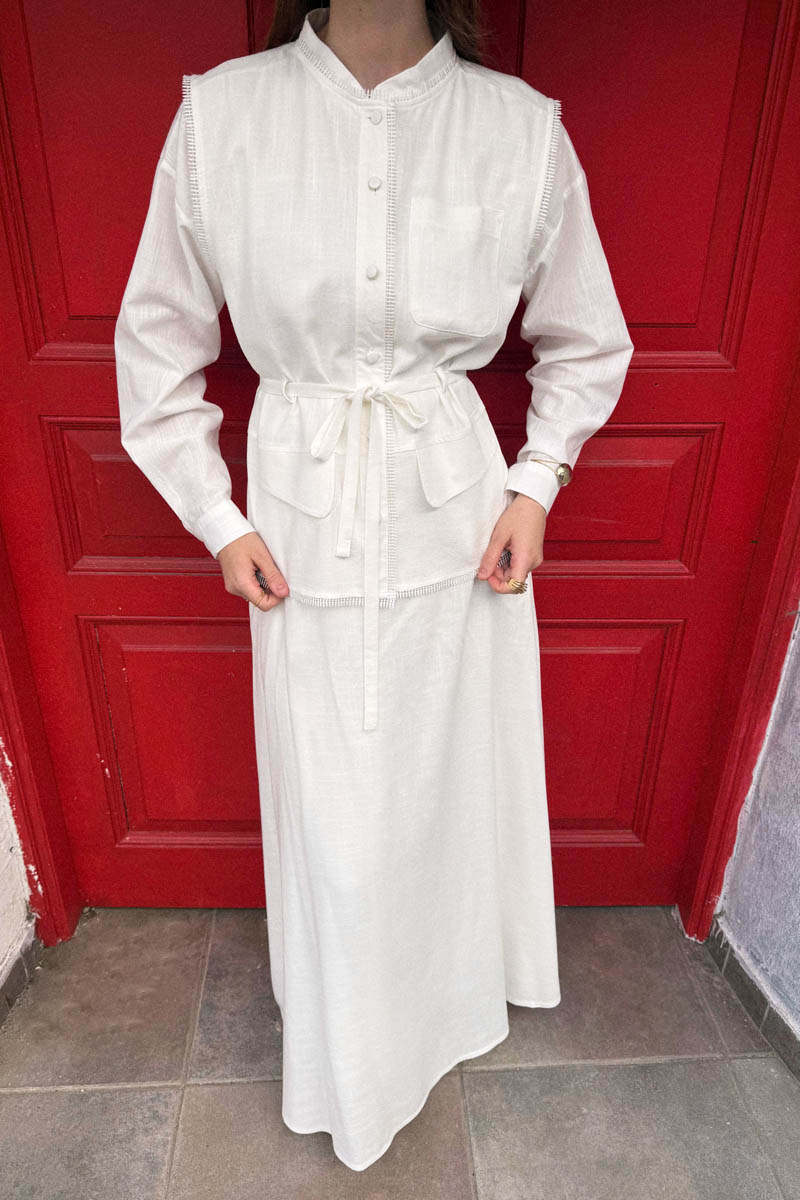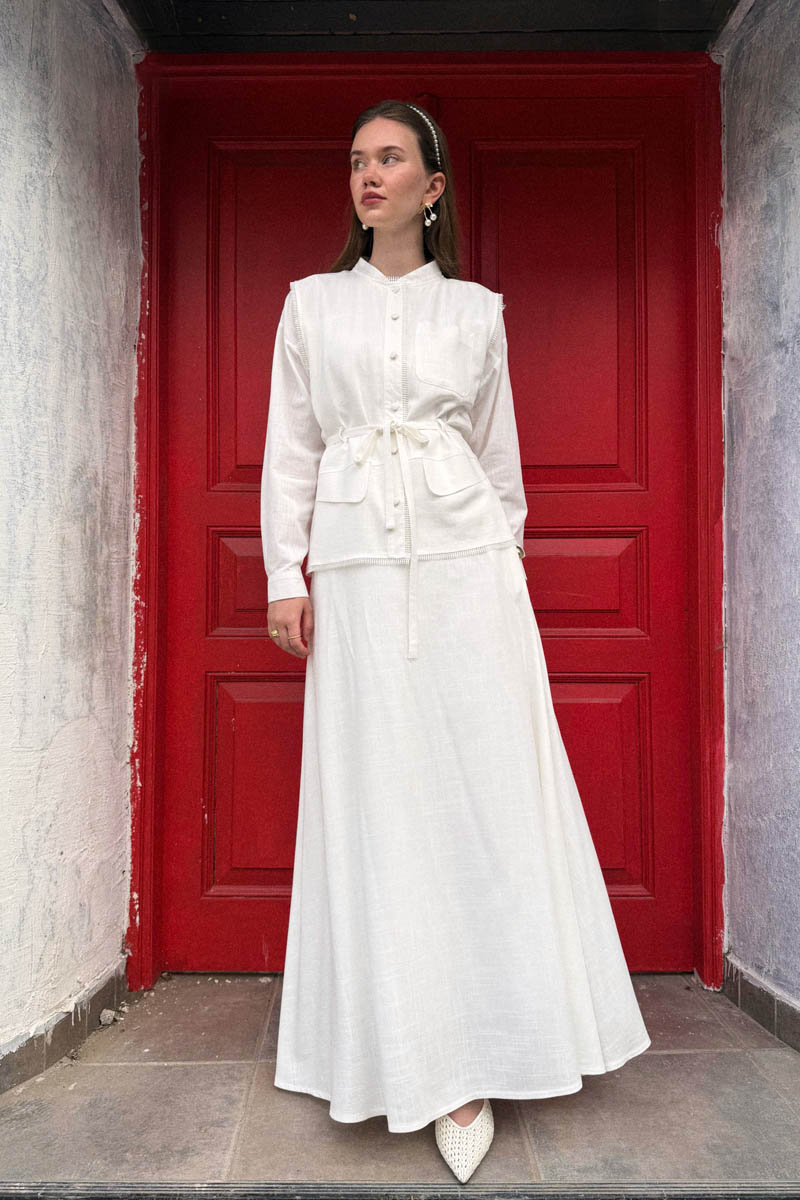 Cepli Viscon Keten Takım Beyaz, Modern ve rahat bir siluet sunuyor. Hafif ve nefes alan viskon-keten karışımı kumaşı sayesinde gün boyu serinlik ve hareket özgürlüğü sağlar. Üst parçası, önündeki cep kapak detaylı ve ince biye kuşaklıdır. Bağlama detayı, takımın vücut tipinize göre ayarlanmasına olanak tanırken, alt parçadaki uzun ve rahat kesim etek dökümlü yapısıyla zarif bir tamamlayıcıdır. Rahatlıkla tercih edebileceğiniz bu takım, minimal ve modern tarzıyla gardırobunuzun vazgeçilmezi olacak.