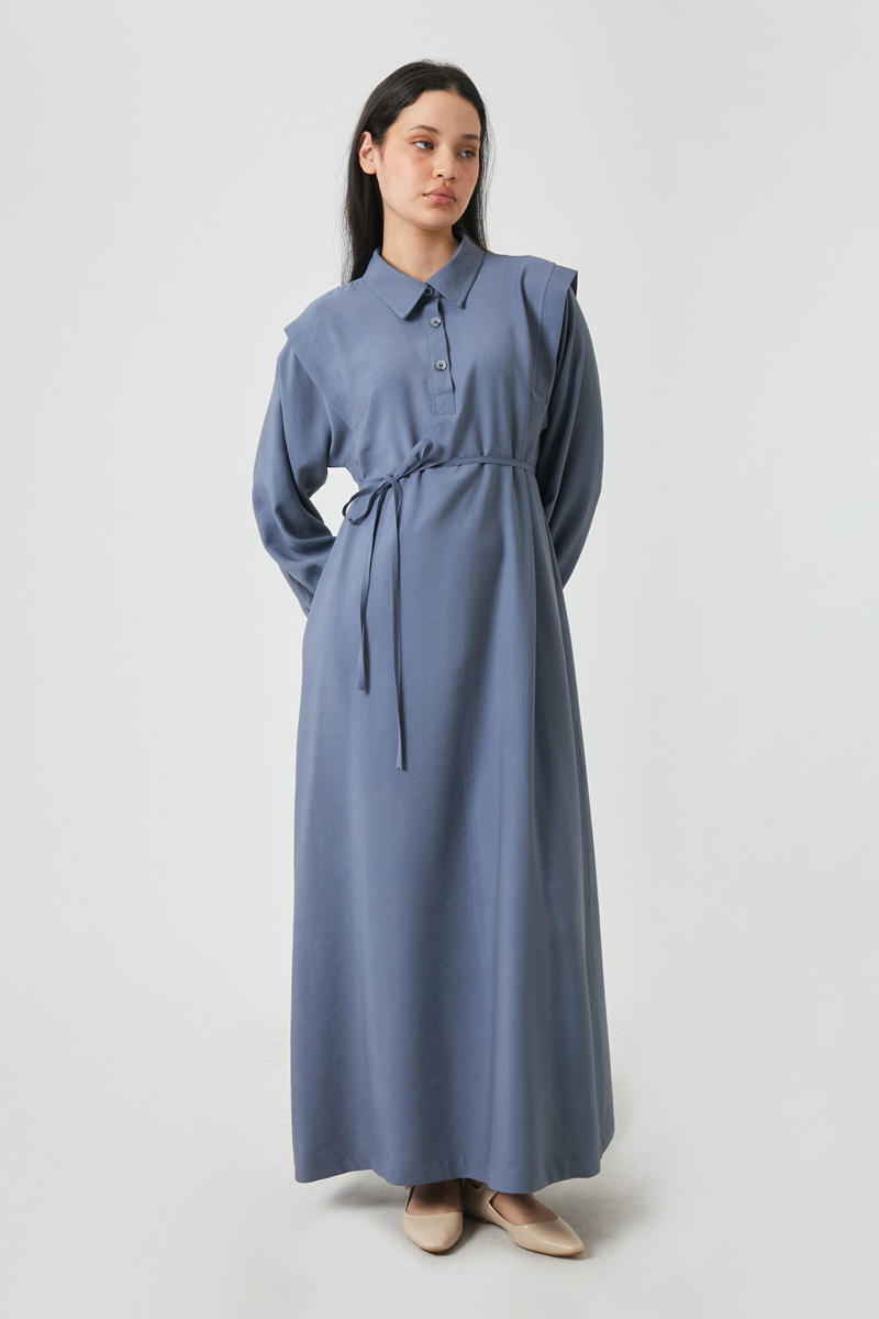 Features a polo collar, half-button closure at the front, panel-stitched sleeves with pleat details, a self-fabric belt, dropped shoulders, gathered cuffs, and side pockets. Unlined and non-transparent. Suitable for daily wear and special occasions.