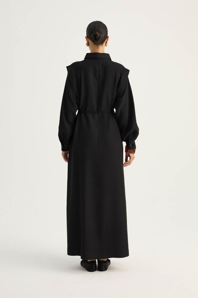 Polo Yaka Elbise Siyah. Polo yakadır, önden yarım düğmelidir, kolu parça dikiş aller detaylıdır, biye kuşaklıdır, düşük omuzludur, kolları büzgülü manşetlidir, yandan ceplidir, astarsızdır, iç göstermez. Günlük kullanım ve özel günlerinizde tercih edebilirsiniz.