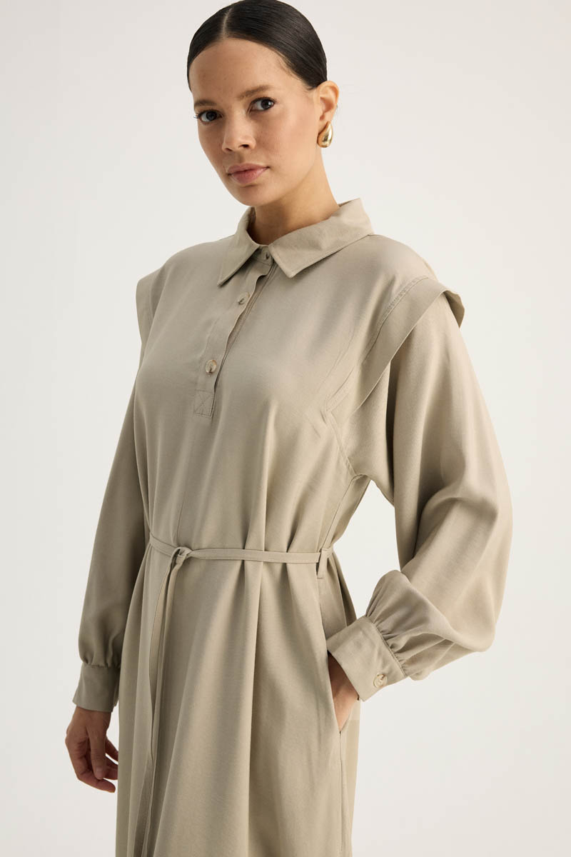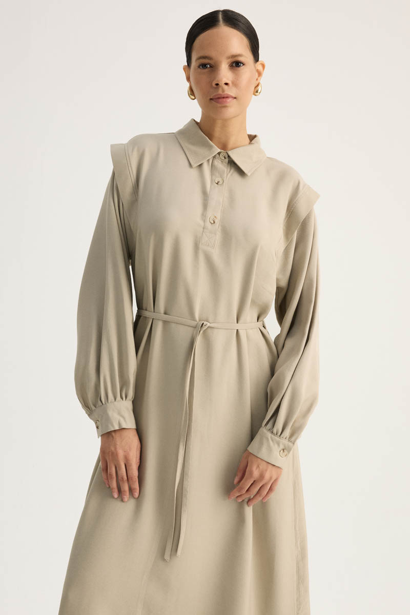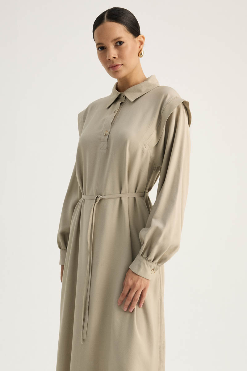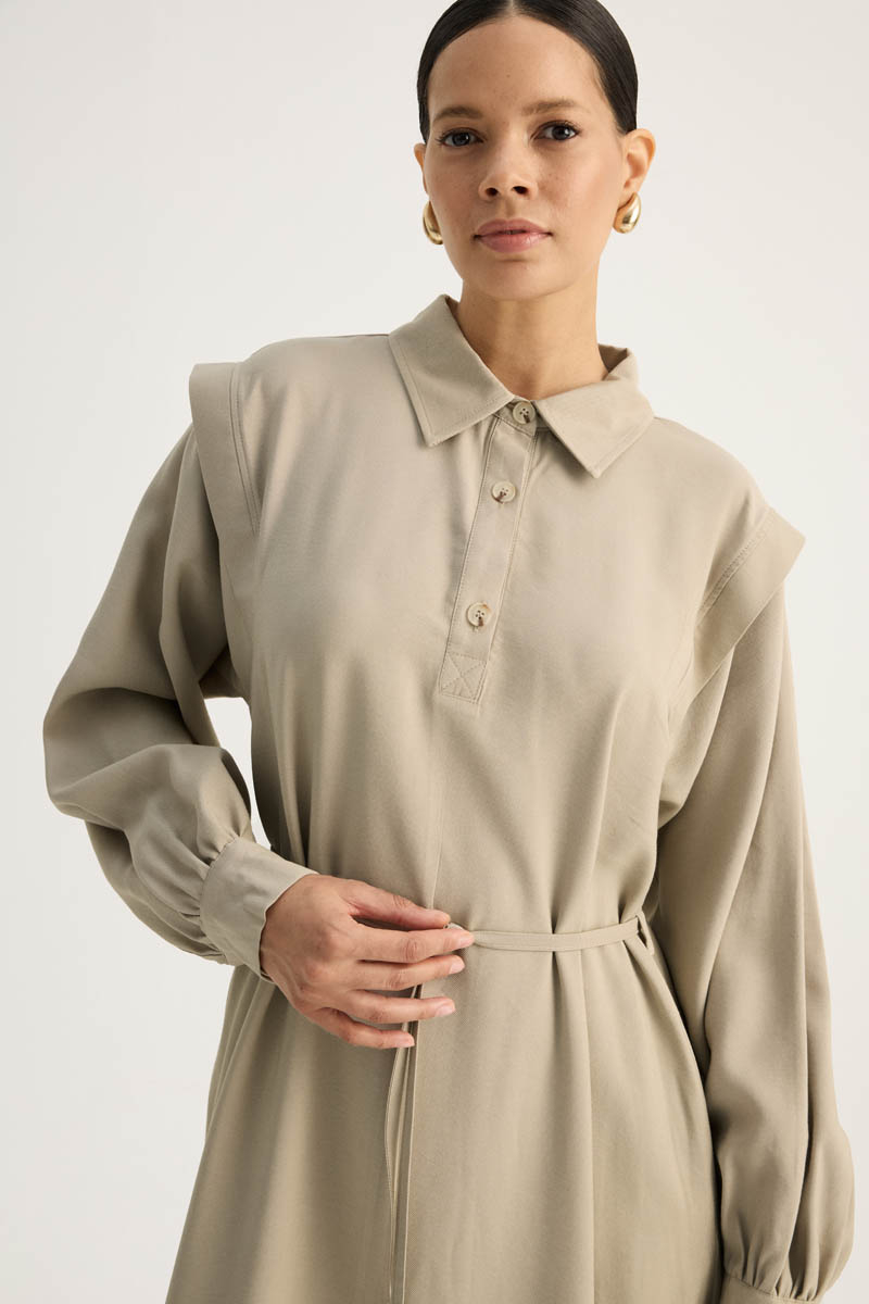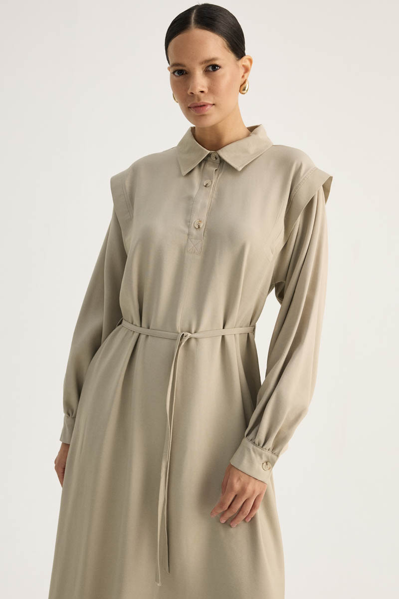 Polo Yaka Elbise Taş. Polo yakadır, önden yarım düğmelidir, kolu parça dikiş aller detaylıdır, biye kuşaklıdır, düşük omuzludur, kolları büzgülü manşetlidir, yandan ceplidir, astarsızdır, iç göstermez. Günlük kullanım ve özel günlerinizde tercih edebilirsiniz.